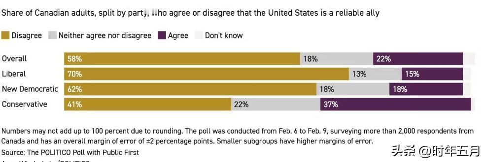 加拿大人现在有多讨厌特朗普治理下的美国?Politico 最新民调显示: 1、58%的加拿大人认为美国不再是可靠盟友; 2、48%的加拿大人认为美国更具威胁性,这一比例超过了俄罗斯的29%; 3、如果被迫做出选择,57%的加拿大人更倾向依靠中国而不是美国; 4、49%的加拿大人认为美加关系在后特朗普时代将得到修复。