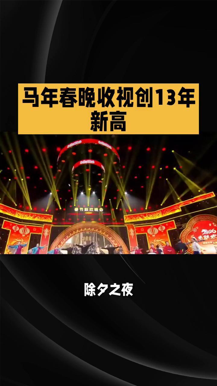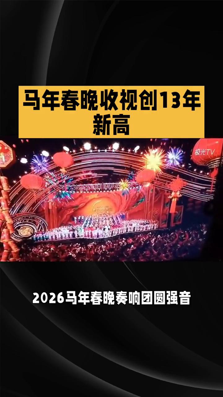 马年春晚收视创13年新高。 13年新高,2026马年春晚奏响团圆强音。2026马年春晚再传捷报,电视直播总收视份额达79.29%,创13年来最高纪录。截至2月17日8时,境内全媒体总触达230.63亿次,同比提升37.3%,奏响四海同春的华美乐章。 除夕之夜,大屏小屏热度空前,近八成电视观众锁定总台春晚,新媒体端直点播触达162.07亿次,同比激增49%。晚会播出期间,平均每分钟3.25亿人同步在线,峰值突破4亿,年轻用户占比超四成,成为收视主力军。 从科技与东方美学的惊艳交融,到覆盖全球近4000家媒体的同步传播,春晚用多元表达联结万家。这份亮眼答卷,既是全球华人的情感共鸣,更是中国文化魅力的生动彰显。