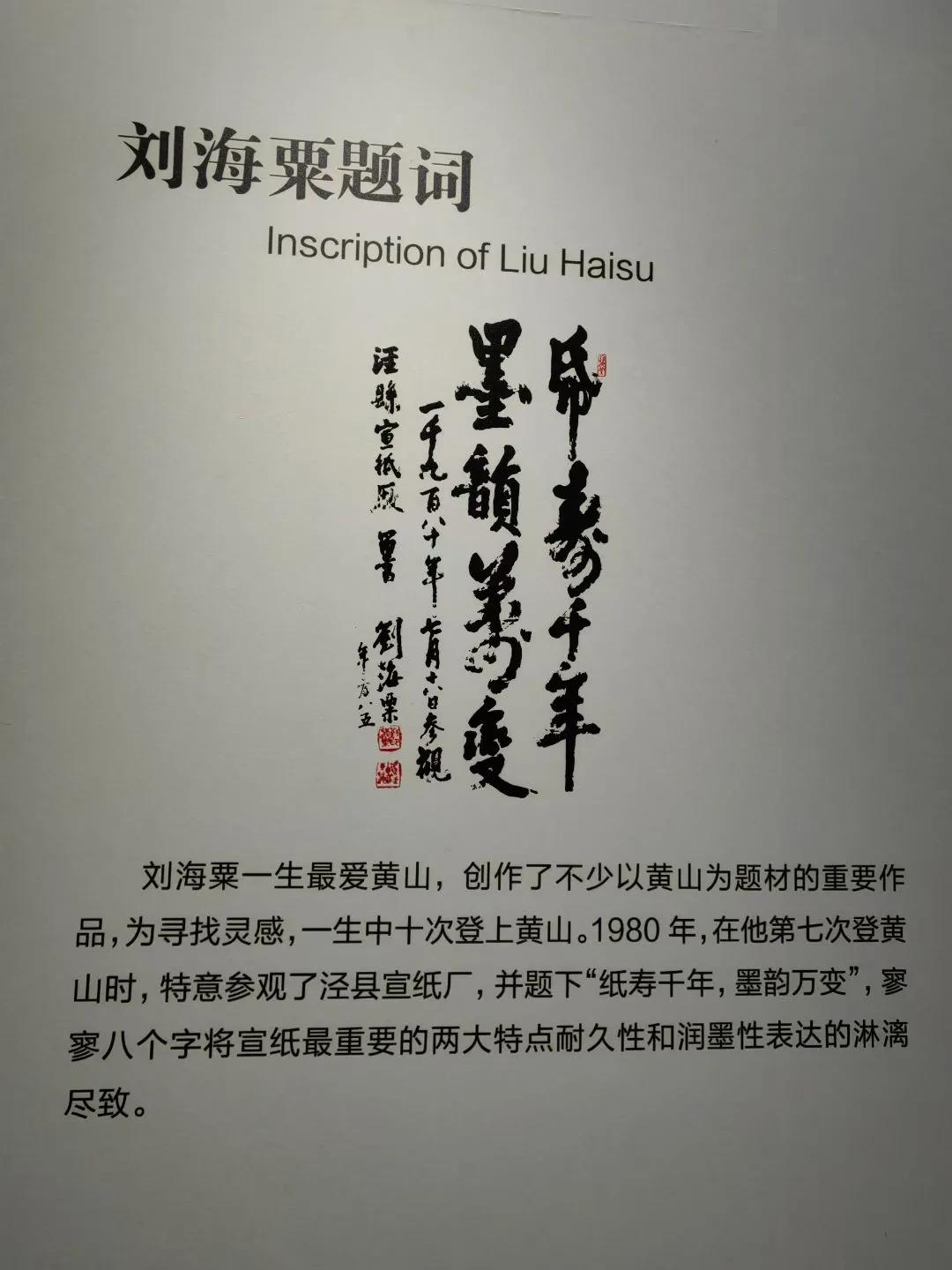 寻古探幽,安徽之行! (红海) 探访安徽在名人墨客(老子、庄子、朱熹)、政治(朱元璋、包拯)、科技(毕昇、邓稼先)、文艺(李公麟、程长庚)、军事(周瑜、戚继光)、商业(胡雪岩)等领域的杰出人物。 海粟题词 Inscription of Liu Haisu 海粟一生钟情黄山,多次以黄山为题材进行创作以寻找灵感,一生十次登临黄山。1980年,他第七次登黄山时,特意参观了泾县宣纸厂,并题下“纸寿千年,墨韵万变”,寥寥数字将宣纸最重要的两大特点——耐久性和润墨性展现得淋漓尽致。 臣「あつ千至 星ニ値の弟の象 一チル百パ第1そ員日参親 活時宣低反留者劉法宗圏題 生「万五