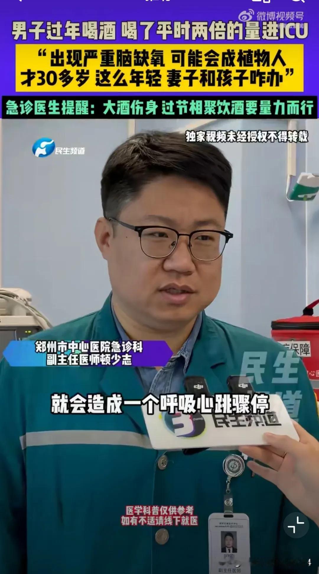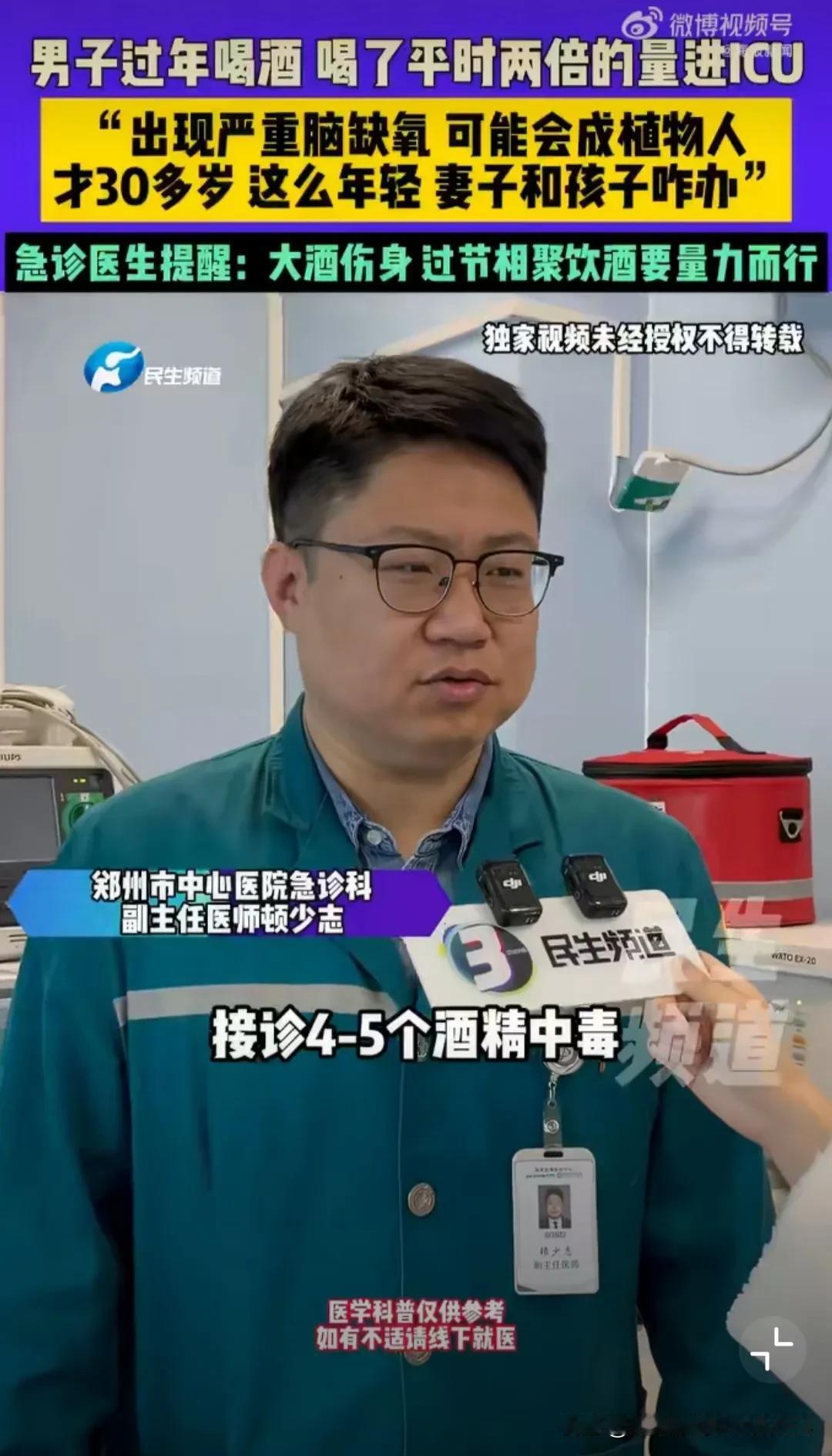 过年喝酒悠着点,不然真“要人命”!河南郑州,一个年仅30多岁的男子,因比平时多喝了点酒,导致严重脑缺氧,很可能成为植物人。 据男子朋友说,他平时也就是一斤的酒量,当时喝了两斤后,突然失去意识(医生分析:呼吸受到抑制), 然后呕吐物堵塞了气道,送到医院时,已经完全叫不醒了。经医生诊断,呼吸心跳骤停,导致严重脑缺氧,即使抢救过来,也很可能成为植物人。 医生还表示,春节期间医院每天都要接诊,四五个酒精中毒的。呼吁大家:过节相聚,饮酒要量力而行。 网友:酒蒙子平时还能劝少喝点,过年是真不好劝!当他朋友也是战战兢兢的[捂脸] 您身边有这样的朋友吗?