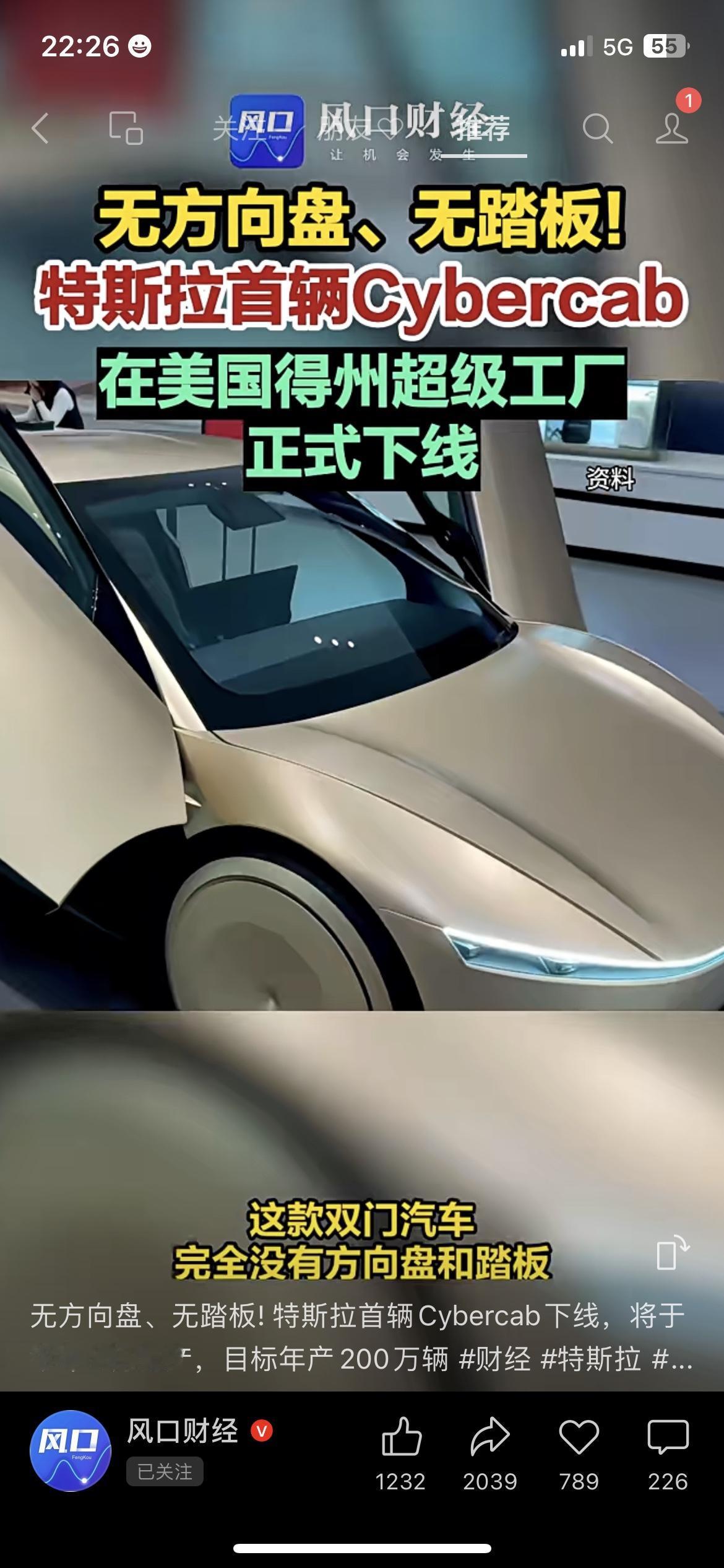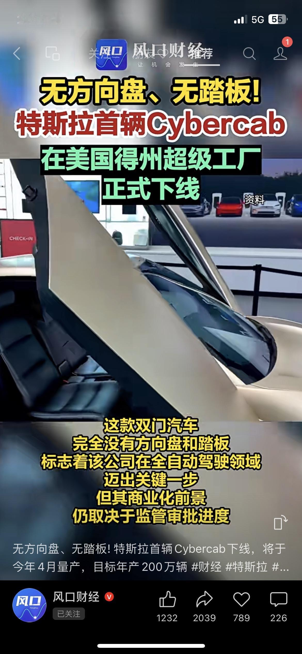 特斯拉彻底疯了! 首辆Cybercab正式下线:无方向盘、无油门、无刹车,完全自动驾驶。 目标年产200万辆,未来出门不用自己开车。 说实话,科技是真牛,但敢坐的人真需要勇气。 以后出行全靠AI,你能接受吗? 你敢坐一辆没有方向盘的车吗? 特斯拉 Cybercab 自动驾驶