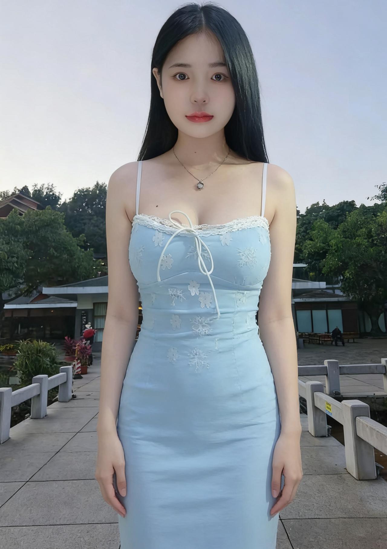 石板桥的凉意, 漫过你赤着的脚踝。 蓝裙紧贴着腰肢, 勾勒出风也描摹不尽的曲线。 ~ 身后的屋宇, 在晨光里晕成浅灰, 而你是这帧风景里, 最鲜亮的一笔。 ~ 湖水在身侧漾着, 把你的影子揉碎, 又拼合, 像在反复确认, 这人间的绝色并非幻觉。 ~ 你的目光越过水面, 落在不知名的远方, 那里有云,有树, 有未说出口的心事, 和一整个季节的等待。 ~ 颈间的吊坠, 在风里轻轻撞着心跳, 每一声, 都比涟漪更软, 比黄昏更慢。 ~ 你站在水畔, 像从画里走出的人, 带着一身清冽, 让所有喧嚣, 都在此刻, 悄然失语。