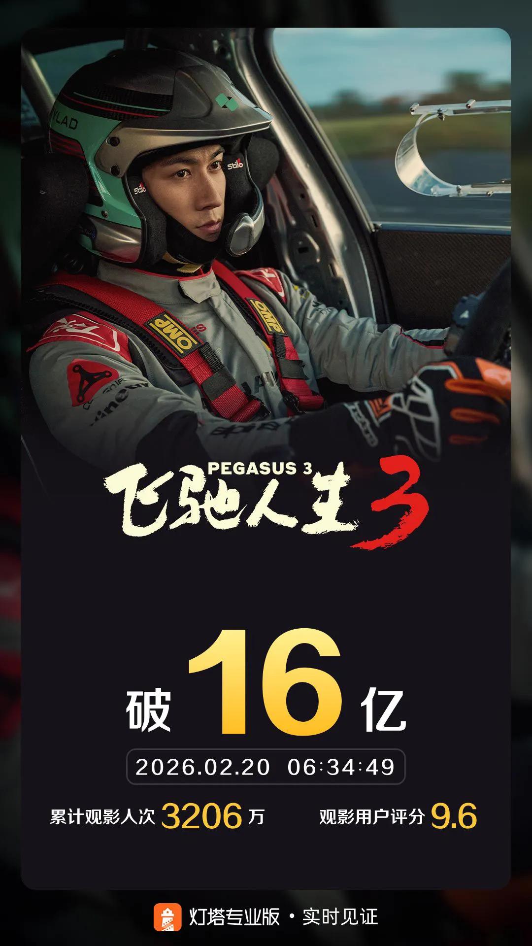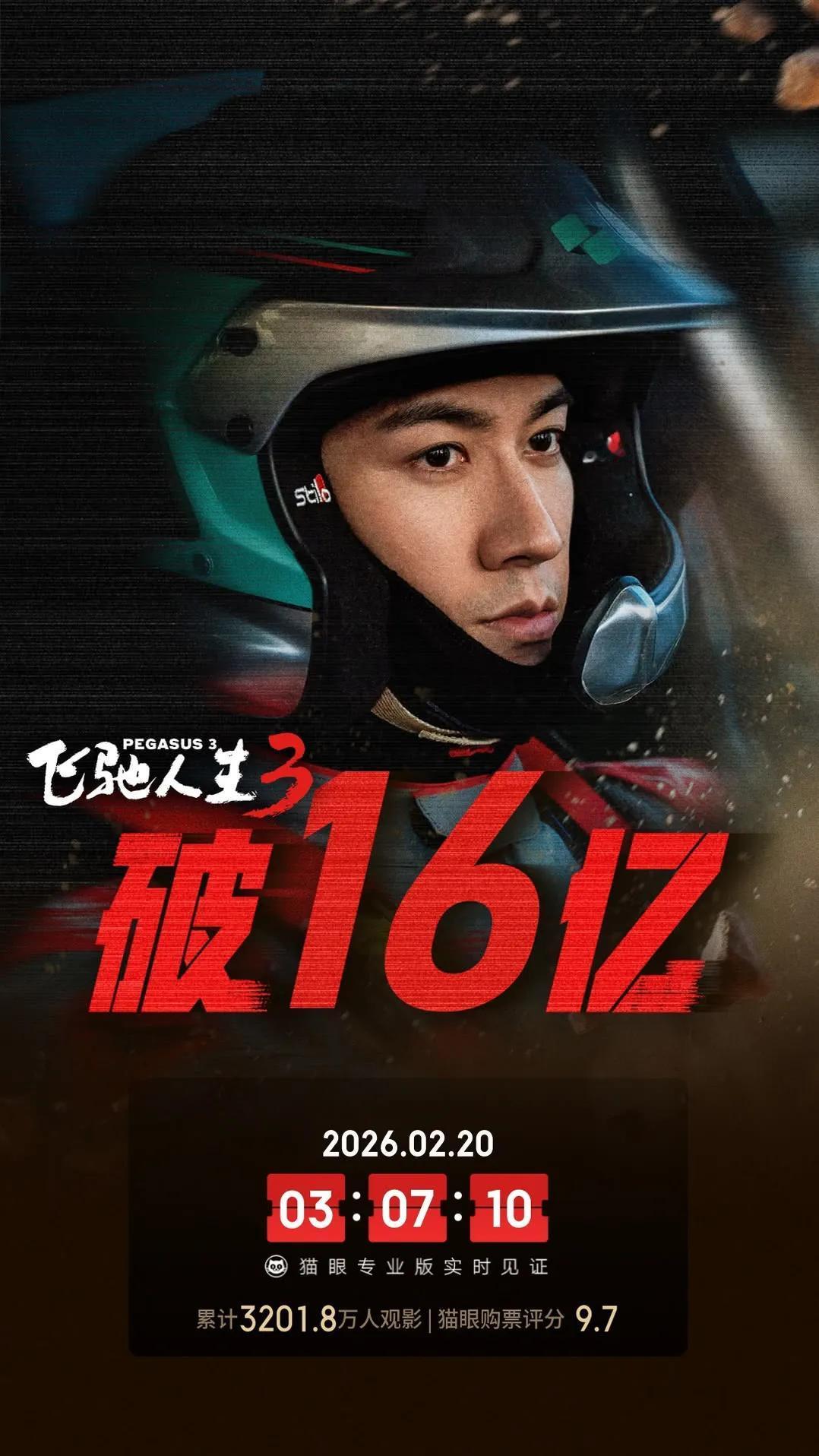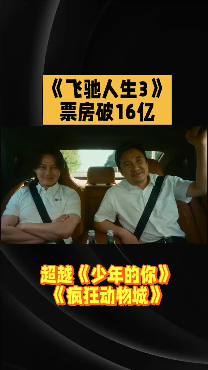 《飞驰人生3》票房破16亿,超越《疯狂动物城》。 由韩寒执导,沈腾、尹正、黄景瑜、张本煜领衔主演,魏翔、沙溢、范丞丞、孙艺洲主演,段奕宏特邀主演,张新成、胡先煦、李治廷、白宇帆、周政杰、高华阳特别出演,贾冰、王安宇、陈永胜、冯绍峰、郝瀚友情出演的喜剧电影《飞驰人生3》累计综合票房破15亿,超越《疯狂动物城》、《变形金刚5》、《少年的你》、《万里归途》,进入内地影史票房总榜60强。 不过由于2026春节档整体票房情况较前5年来说不算乐观,《飞驰人生3》最终票房能否超越《疯狂动物城2》的中国内地票房还未可知。飞驰人生第三部 春节档电影 飞驰人生3