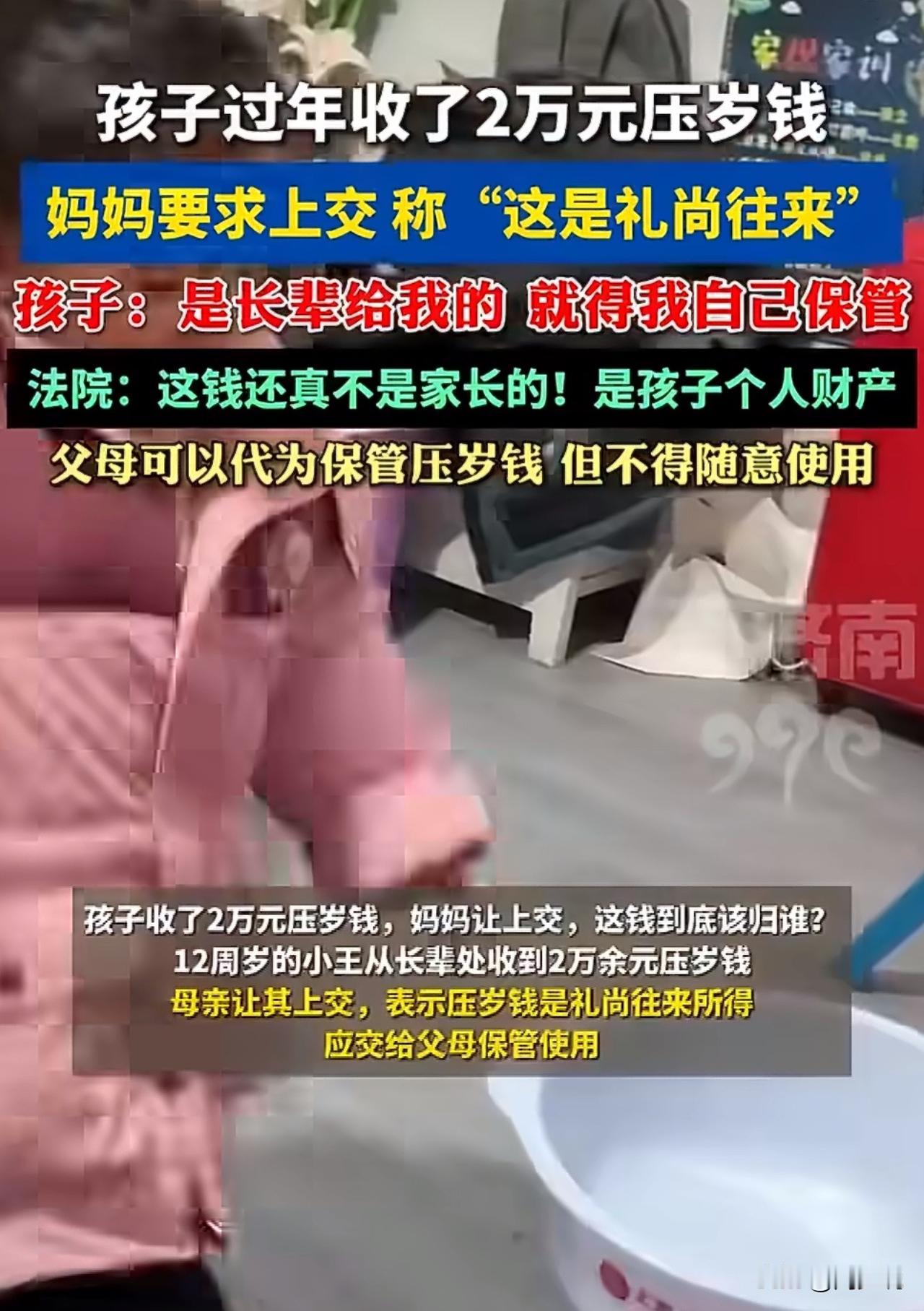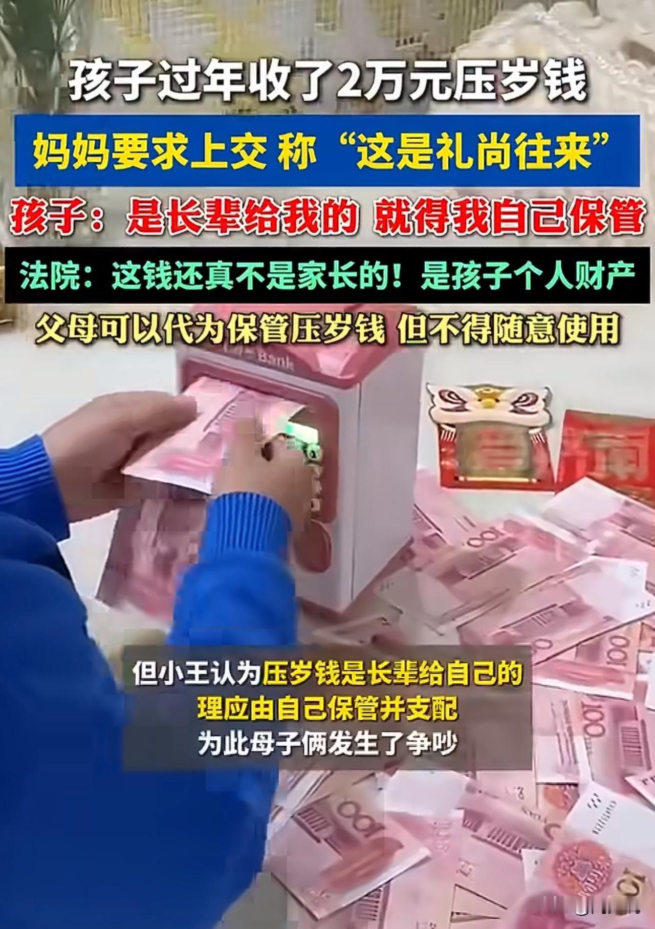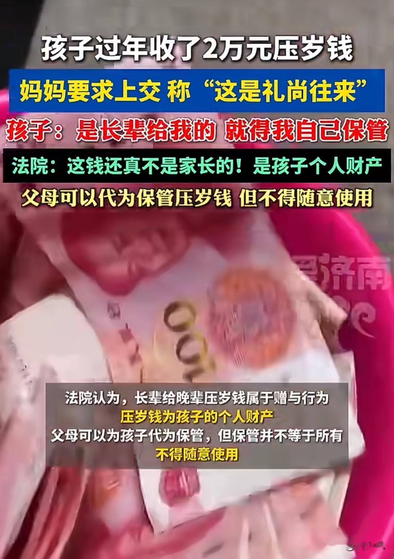 #孩子的压岁钱谁来管更合适#“2万压岁钱引发母子争执!”近日,春节刚过,一场压岁钱风波冲上热搜。一位12岁小孩收到两万多元红包,妈妈以“礼尚往来”为由要求上交保管,孩子却不肯让步,坚持这是长辈给自己的心意,为此母子俩吵得不可开交。 这事在网上传开后,引发网友热议。不少网友深有共鸣:“小时候压岁钱全被爸妈收走,说替我存着,最后都没影了”。 也有网友说:“理解妈妈的顾虑,但直接没收太伤孩子心”。 还有人理性发声。“压岁钱不只是钱,更是孩子的权利与尊严。 针对此母子的争执,法院给出明确说法:长辈给晚辈的压岁钱,属于赠与行为,是孩子的个人财产。父母可以代为保管,可这并不等于拥有所有权,更不能随意挪用。 在周少看来,压岁钱从来不是家庭里的“权力之争”,反倒藏着最好的教育契机。强行收缴,看似管住了钱,却可能悄悄消耗孩子的信任感;完全放任不管,又容易让孩子养成乱花钱的习惯。 周少建议这位妈妈不妨试着和孩子一起做规划,留一小部分让他自由支配,剩下的共同储蓄,既能教会孩子珍惜与责任,也能守住亲情的温度。 法律划定边界,教育传递温度。比起纠结钱归谁管,不如借着红包,帮孩子上好人生第一堂财商课。尊重孩子的小小权利,慢慢引导他学会理性支配,这份成长,远比红包本身更珍贵。#周少说教育# #寻美三湘#