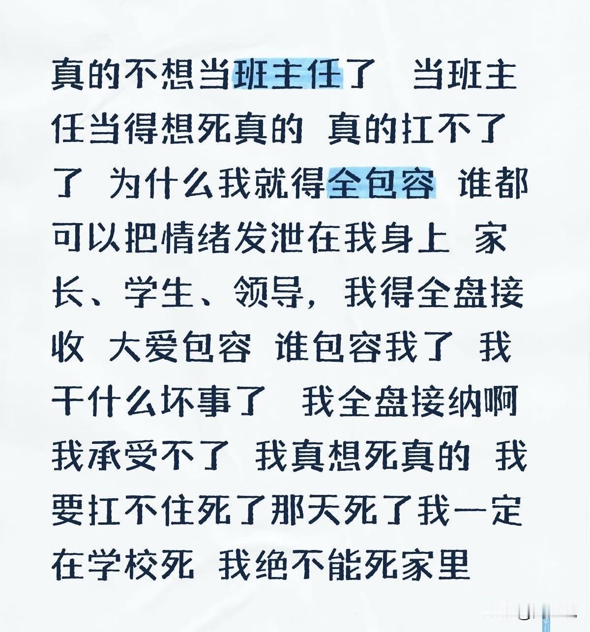 “真不想当班主任了,扛不住了!”近日,一位一线教师的崩溃倾诉,看哭无数教育人。这位老师坦言,自己每天要面对学生的调皮、家长的指责、领导的要求,所有负面情绪都要自己默默消化,要求自己做到包容理解,可却没人真正体谅她的委屈。她不是犯了错,却要全盘接纳所有人的情绪,这份重压,让她几乎走到崩溃边缘。 这事在网上传开后,不少网友看完直呼破防:“当过班主任才懂,看似管着一个班,实则是最身不由己的人”。 也有网友认为:“不是老师不坚强,是压在身上的担子太重了”。 还有网友更是坦言:“谁都能对老师提要求,可老师的情绪,往往没人在意”。 在周少看来,其实在教育行业里,这样的心声并不少见。班主任看似是班级的管理者,更像是多重角色的结合体,既要抓教学,又要管纪律,还要协调家校关系,长期处在情绪高压的状态下。 我们总在强调老师要爱学生、有担当,却常常忽略了,老师也是普通人,也会累、会委屈、会撑不下去。教育的本质是相互理解,不该只要求老师单方面付出和包容。 总之,比起一味强调教师的奉献,多给他们一点理解、一份包容、一个释放情绪的出口,才是更该做的事。教育从来不是一个人的孤军奋战,只有让老师先被善待,他们才能更从容地把温暖传递给孩子。#寻美三湘# #周少说教育#