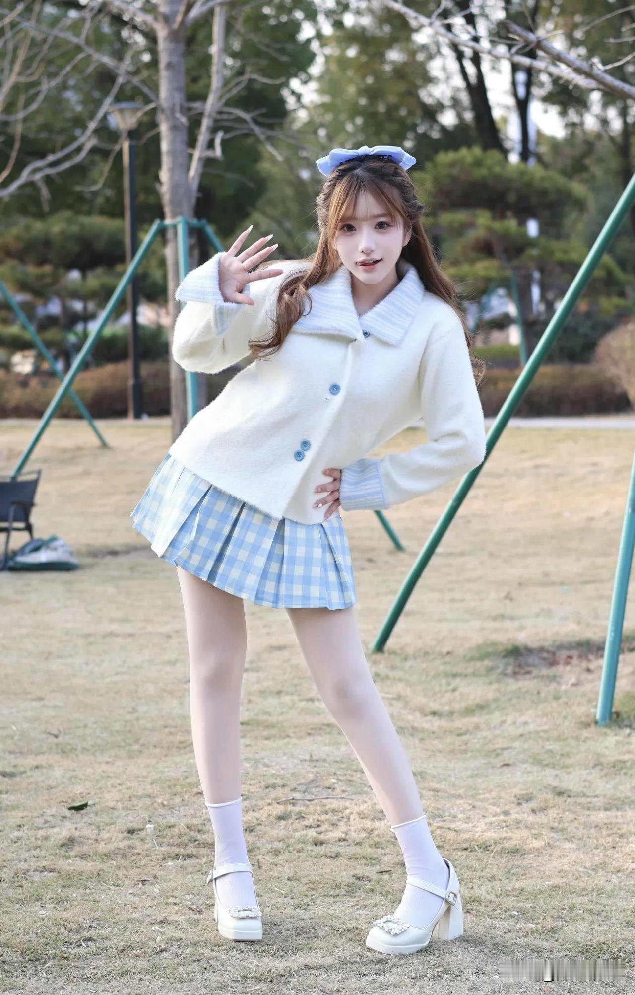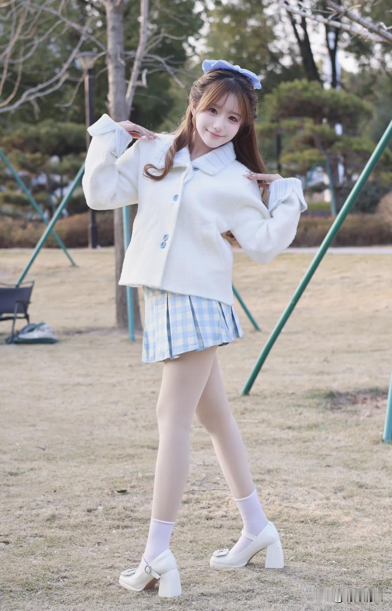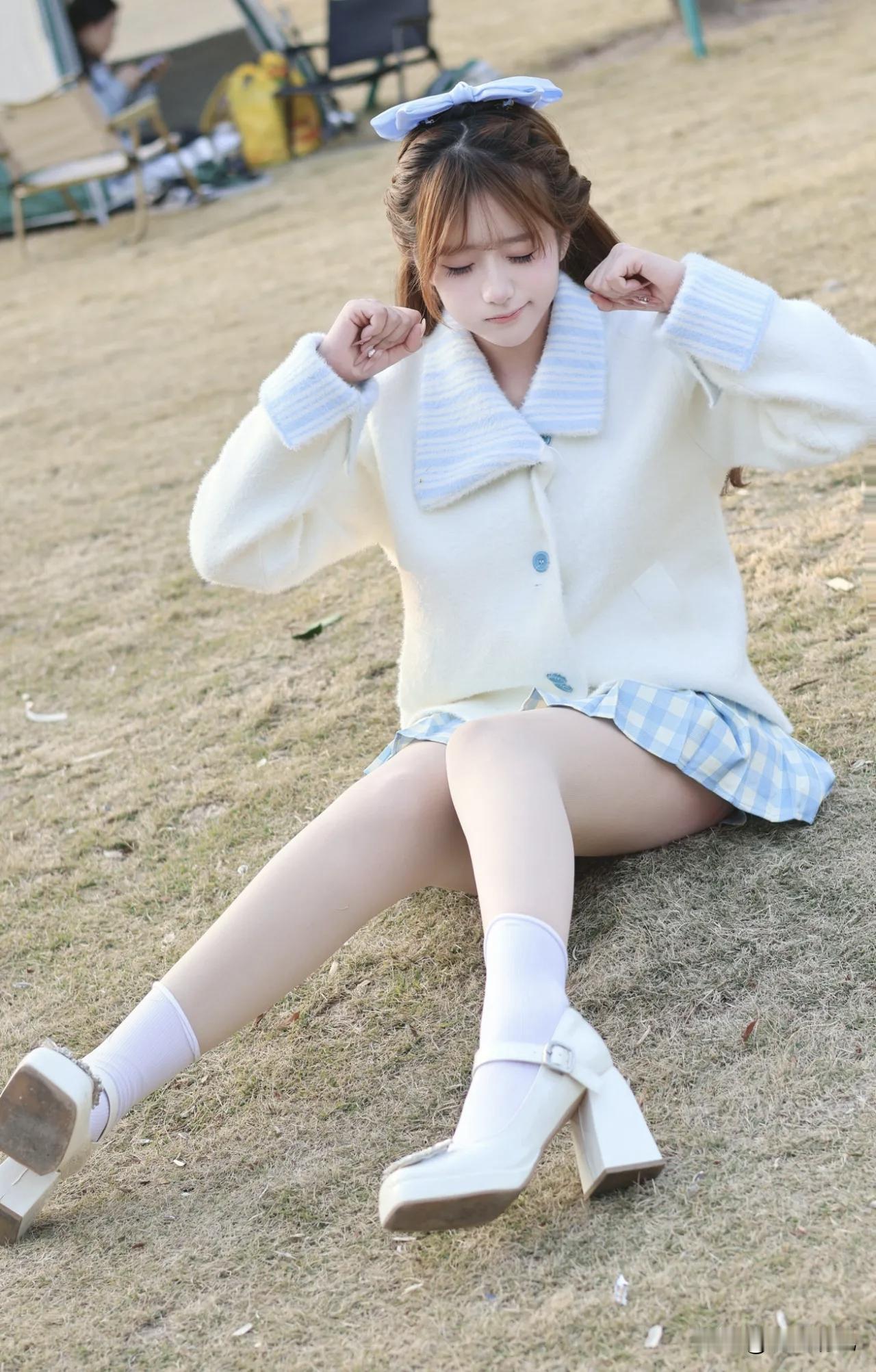 草地上拍照,蹲下来捏拳闭眼那张最戳我。 小姐姐穿的白色绒外套,底下配蓝白格裙子