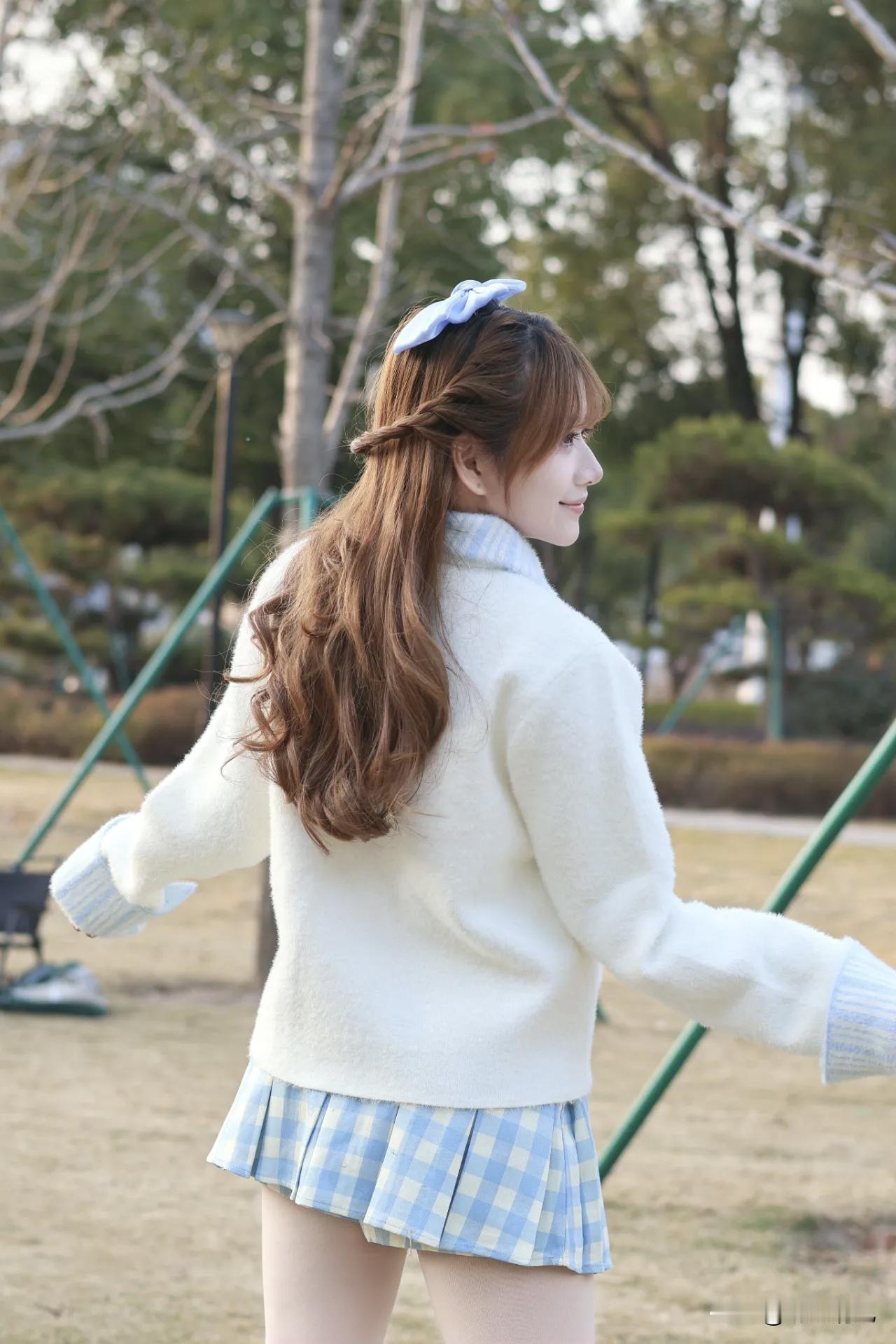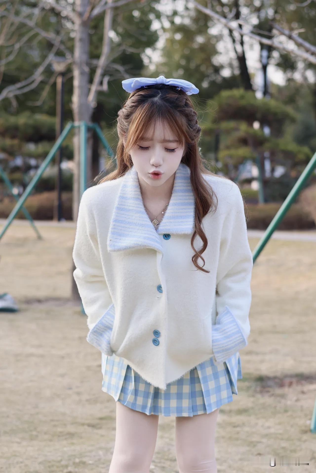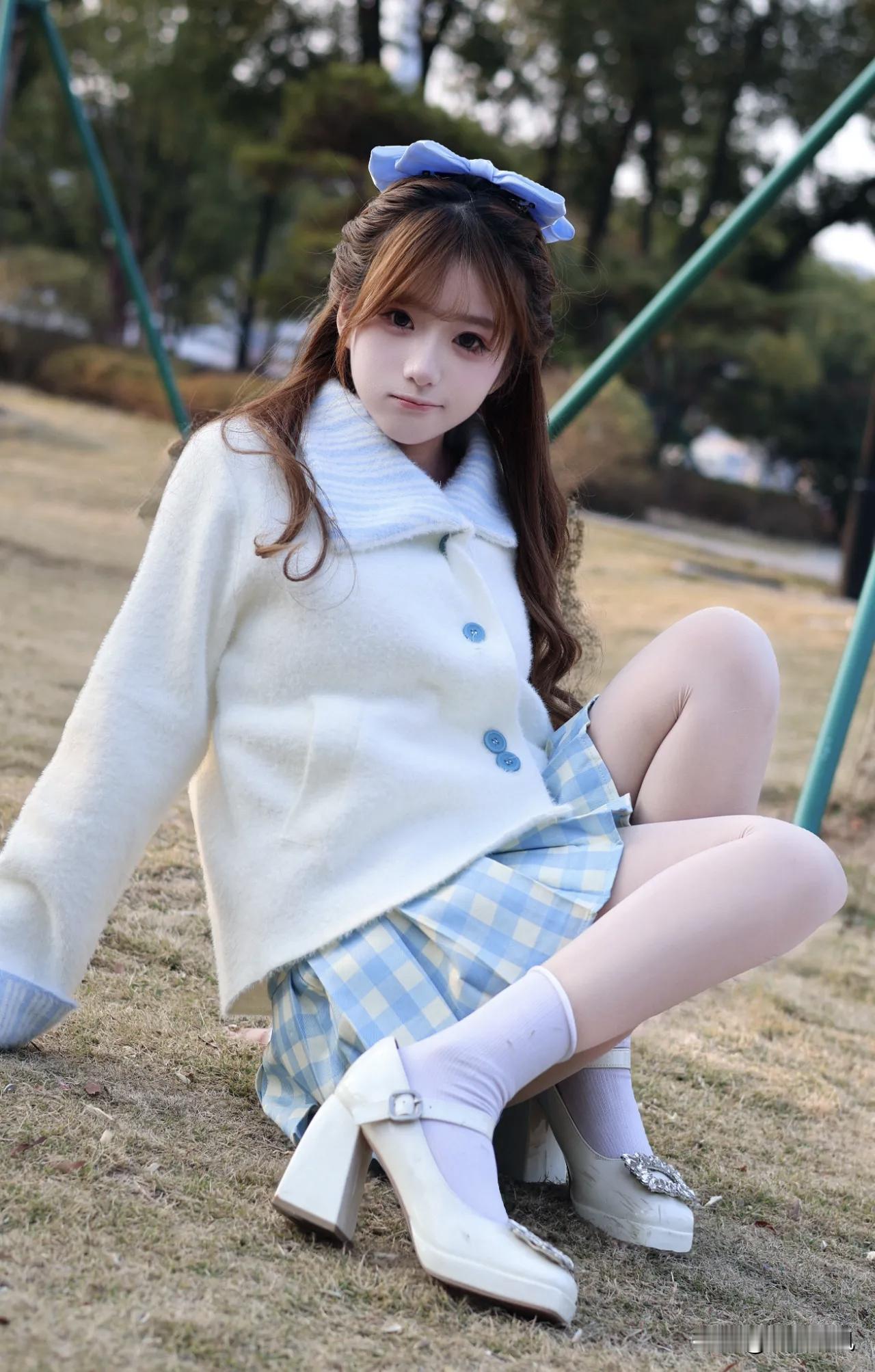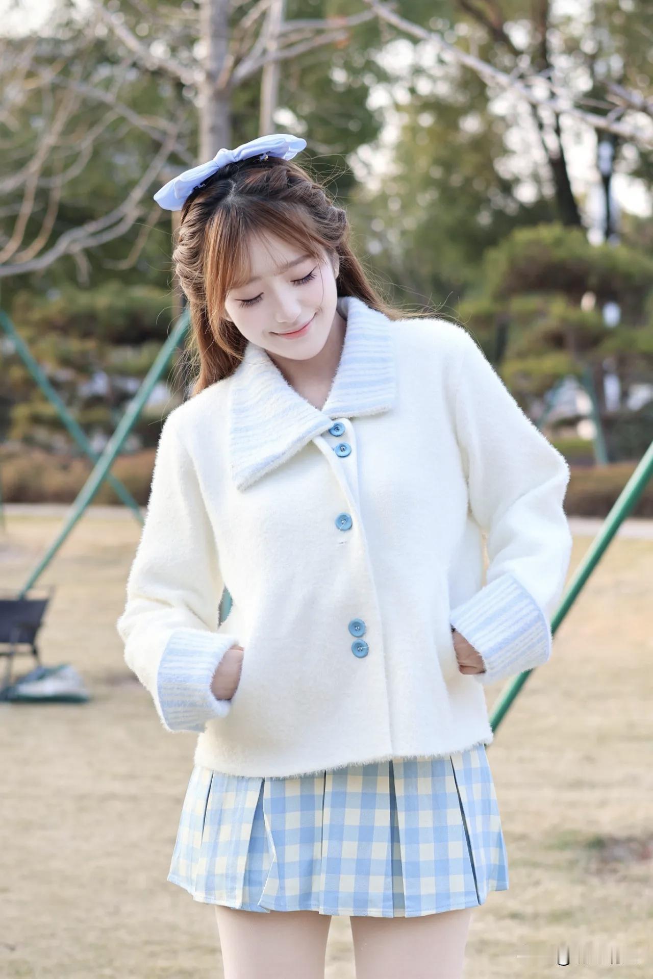 草地上拍照,蹲下来捏拳闭眼那张最戳我。 小姐姐穿的白色绒外套,底下配蓝白格裙子