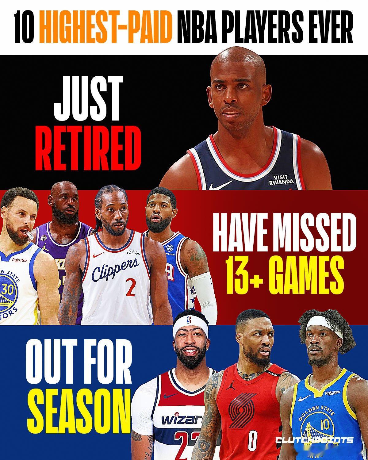 NBA历史总薪资前10球员,本赛季1个退役,3个赛季报销,4个缺席了至少13场比赛。