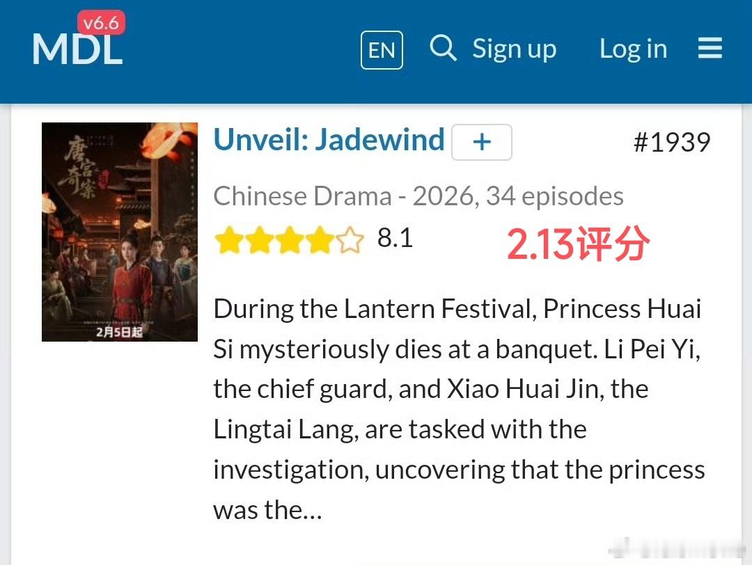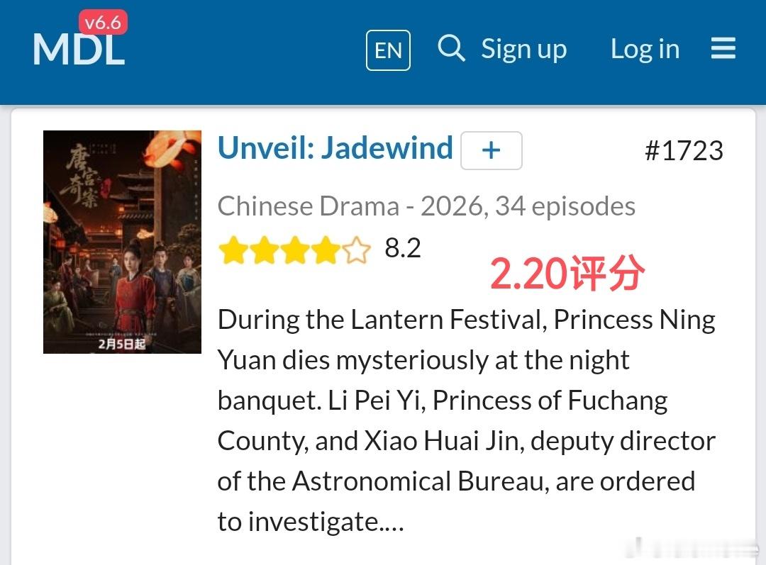 好消息!《唐宫奇案》MDL涨分,由8.1涨到了8.2。