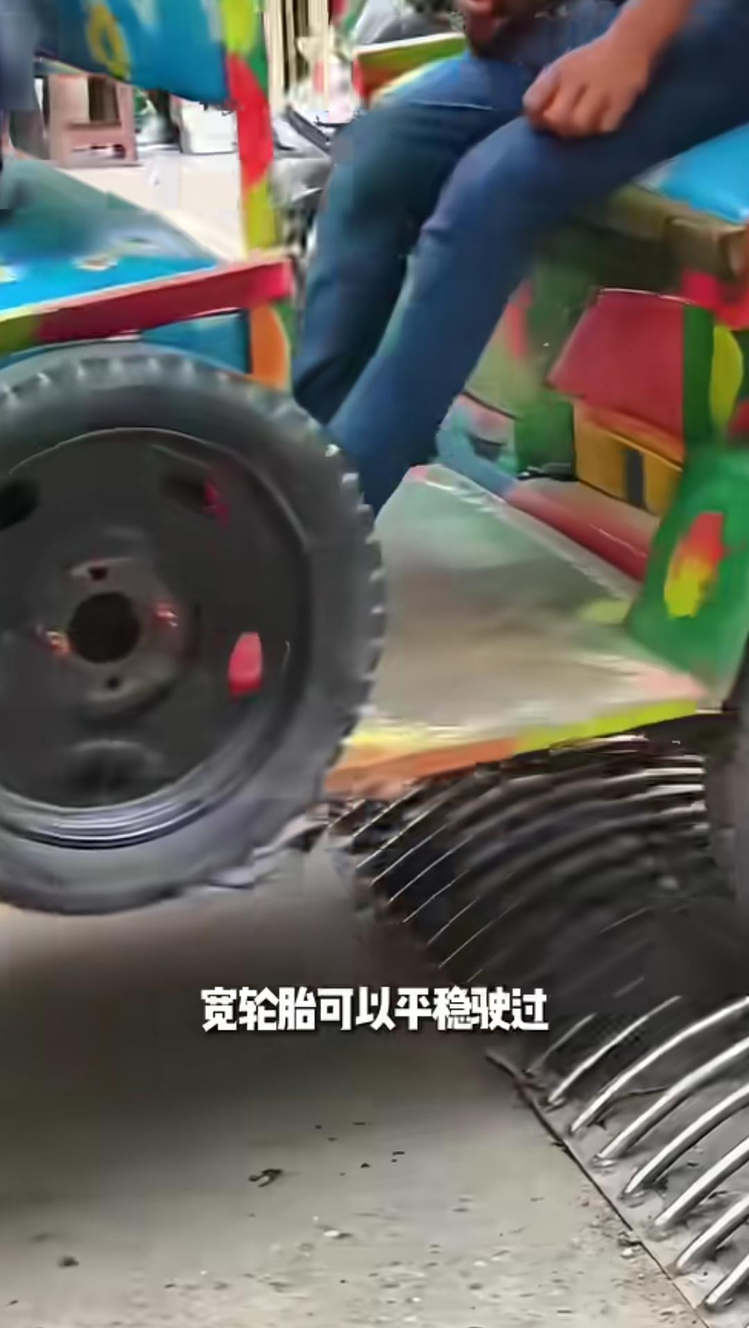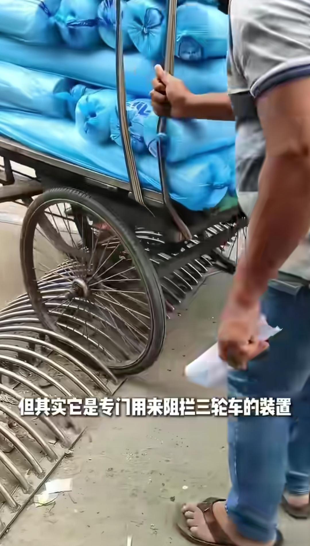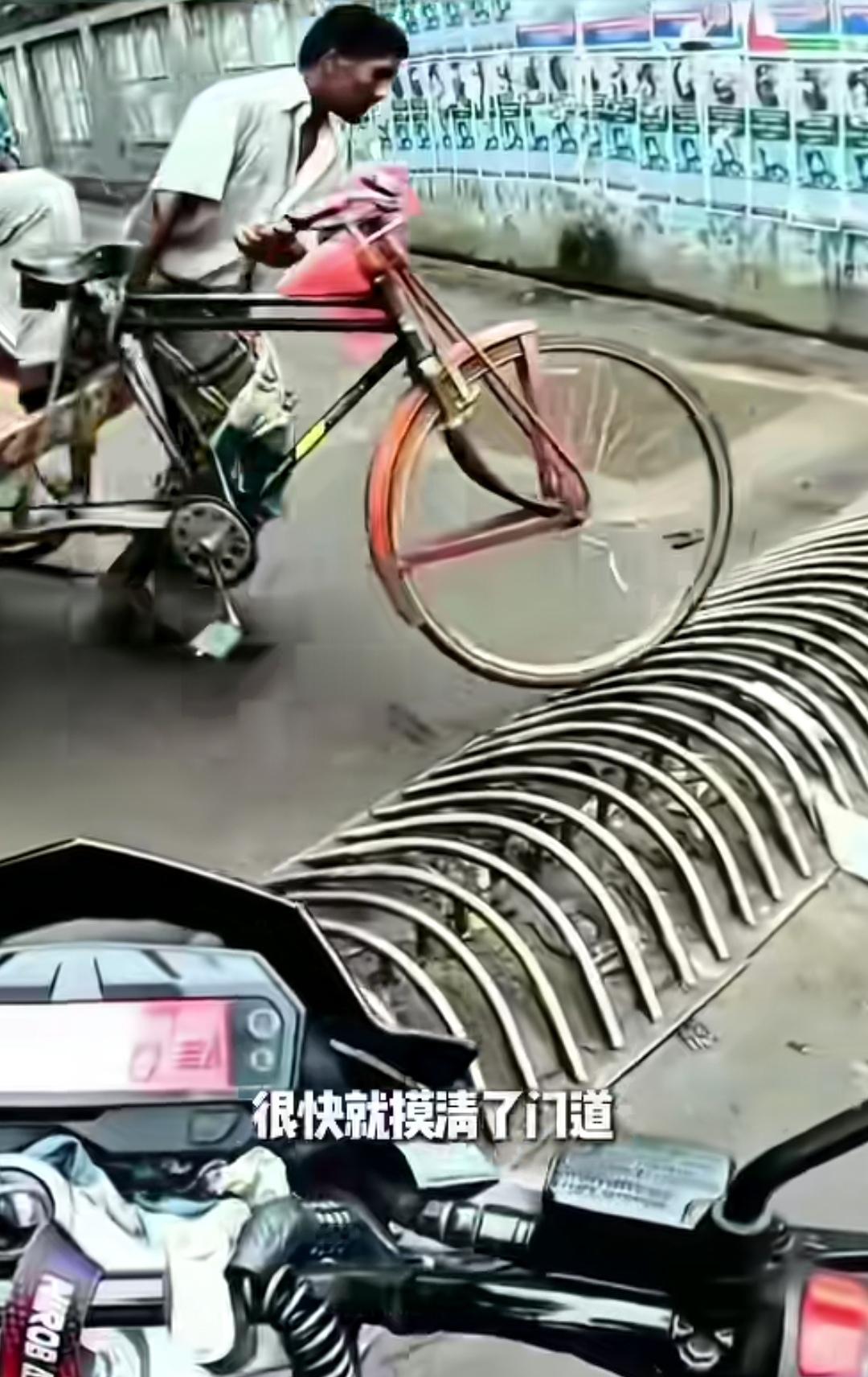 孟加拉专门拦截三轮车的路障。 (如图所示)在孟加拉,有些路段为了拦截人力三轮车,专门设计了专用路障,宽轮车可以过,窄轮车很容易陷入。但魔高一尺,道高一丈,聪明的三轮车夫很快就发现了窍门,千万不能直接过路障,只要和路障倾斜成45度,这种路障就不算事了。