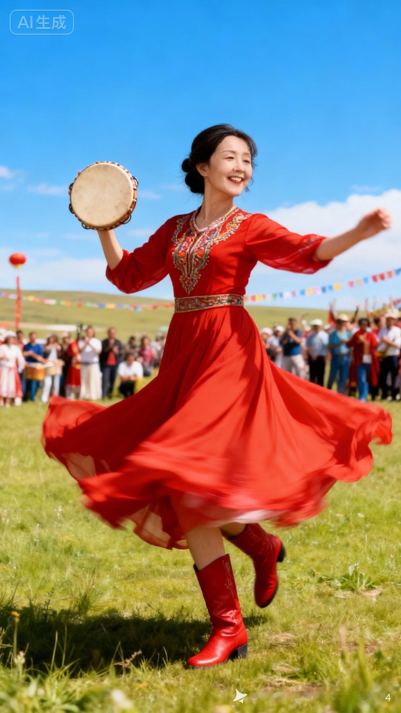 一位红裙美女在草地上欢快跳舞。
