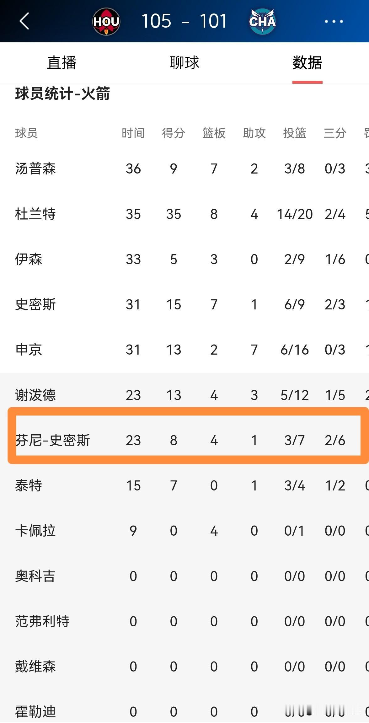 我终于可以怒赞火箭大将芬尼-史密斯了!在今天火箭客场以105:101击败黄蜂的比