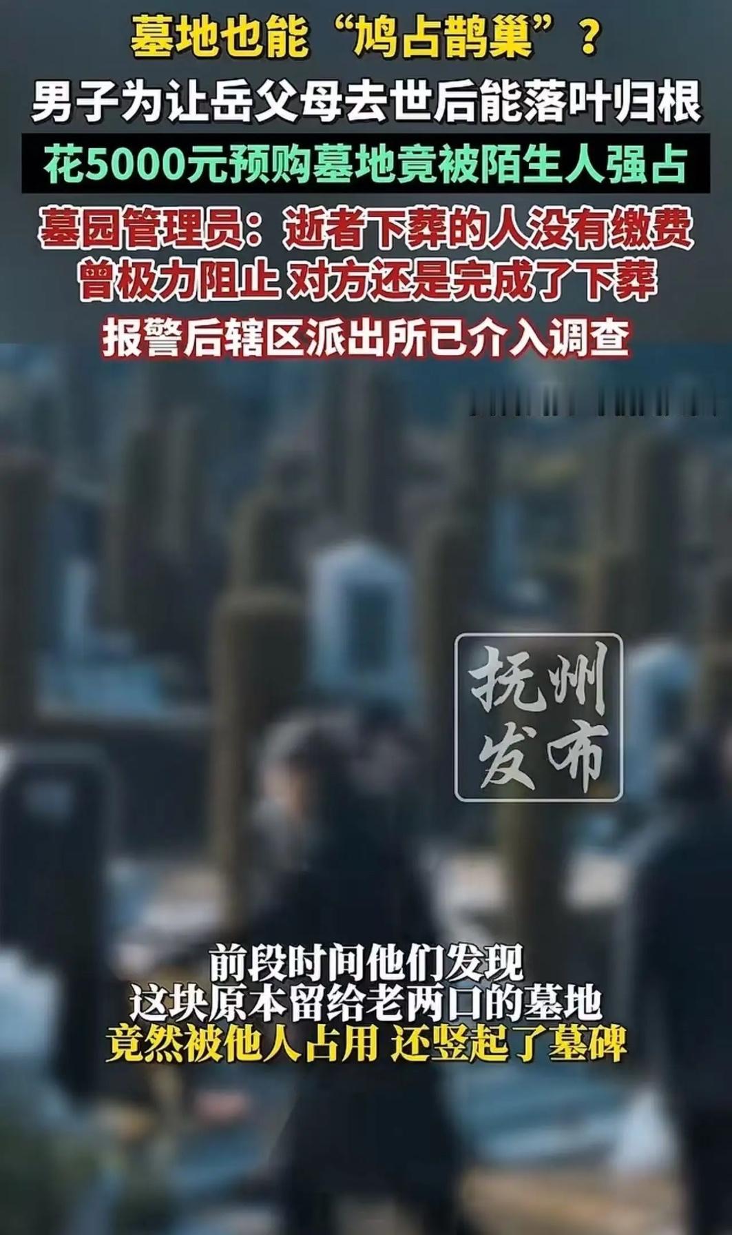 “见过抢钱的,没见过抢墓地的!”江苏,老人花5000元提前买好墓穴,7年后去看竟发现墓地被别人占了!对方:“反正空着也是空着,我们需要就先用了!大不了我们花钱买下来!”墓园管理方:拦不住,根本拦不住! 离谱!江苏老人提前购置墓地竟遭强占 “见过抢钱的,没见过抢墓地的!”近日,江苏扬州发生的一起墓地被强占事件,引发了社会的广泛关注与热议。 2019年,扬州的闵先生考虑到家中老人年事渐高,为让老人安心,也为了日后避免手忙脚乱,经过慎重挑选,在当地一家正规墓园花费5000元,为老人购置了一块空墓地,并办理了完整的购置手续,拿到了相关凭证。原本,这是为老人百年之后准备的安息之所,承载着子女对老人深深的爱与关怀。购置之后,因家中老人身体尚健,这块墓地便一直闲置,闵先生一家也只是偶尔前往墓园查看,确保墓地完好。 然而,前段时间,当闵先生陪着老人再次前往墓园时,眼前的景象让他们怒火中烧。原本空置的墓地之上,不仅被人平整了土地,还竖立起了一块崭新的墓碑,墓碑上刻着陌生的姓名,显然已经被他人擅自占用。好好的一块专属墓地,没有经过任何沟通,没有收到任何通知,就这样被强行侵占。 闵先生一家当即找到墓园管理人员询问情况,墓园管理方的回应却让他们更加无奈:“人家抬着棺材来的,十几号人,我们拦不住啊!”而强占墓地的那家人态度更是嚣张,轻飘飘地抛出一句:“反正空着也是空着,我们需要就先用了!大不了我们花钱买下来!”仿佛这墓地是无主之物,他们可以随意处置。 从法律角度来看,根据《民法典》第二百六十七条明文规定:“私人的合法财产受法律保护,禁止任何组织或者个人侵占、哄抢、破坏。”闵先生一家与墓园签了合同、交了钱,对这块墓地拥有合法使用权,这个使用权受法律保护,不是谁觉得“空着”就能占的。 目前,当地警方已经介入调解。希望这起事件能够得到妥善解决,让违法者受到应有的惩处,还闵先生一家一个公道,也维护法律的尊严和社会的公序良俗。见过抢钱的,没见过抢墓地的 老人提前花5000元钱买墓穴,过7年去看已给人家占用了