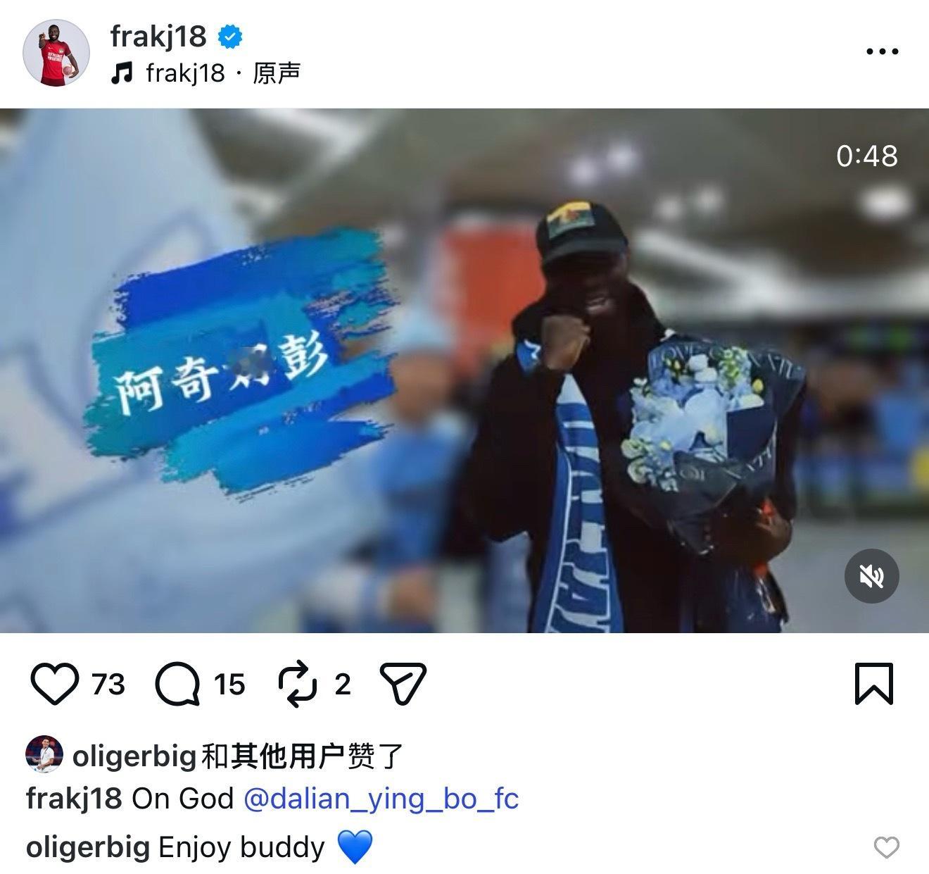 大连英博中超联赛大连英博 阿奇姆彭更新社交动态,球员签约完毕,正式加盟大连英博!球员对球迷在机场的迎接感到惊讶等阿奇姆彭到了梭鱼湾,会更惊讶的 大连·水月松间温泉