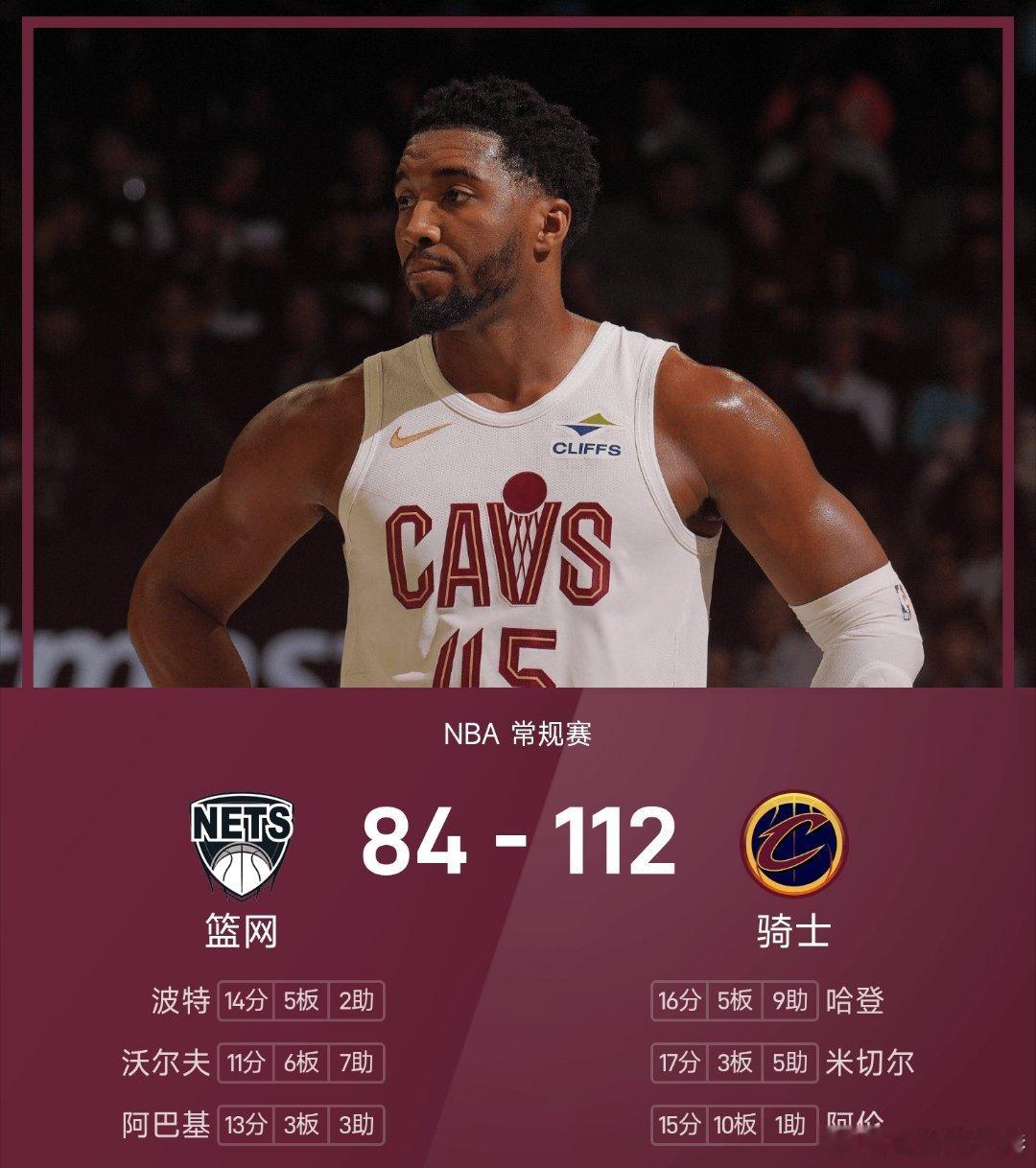 篮网vs骑士nba 骑士对阵篮网。双方全场战罢,骑士112-84战胜篮网。米切尔砍下全场最高的17分3板5助,率领骑士成功取胜。