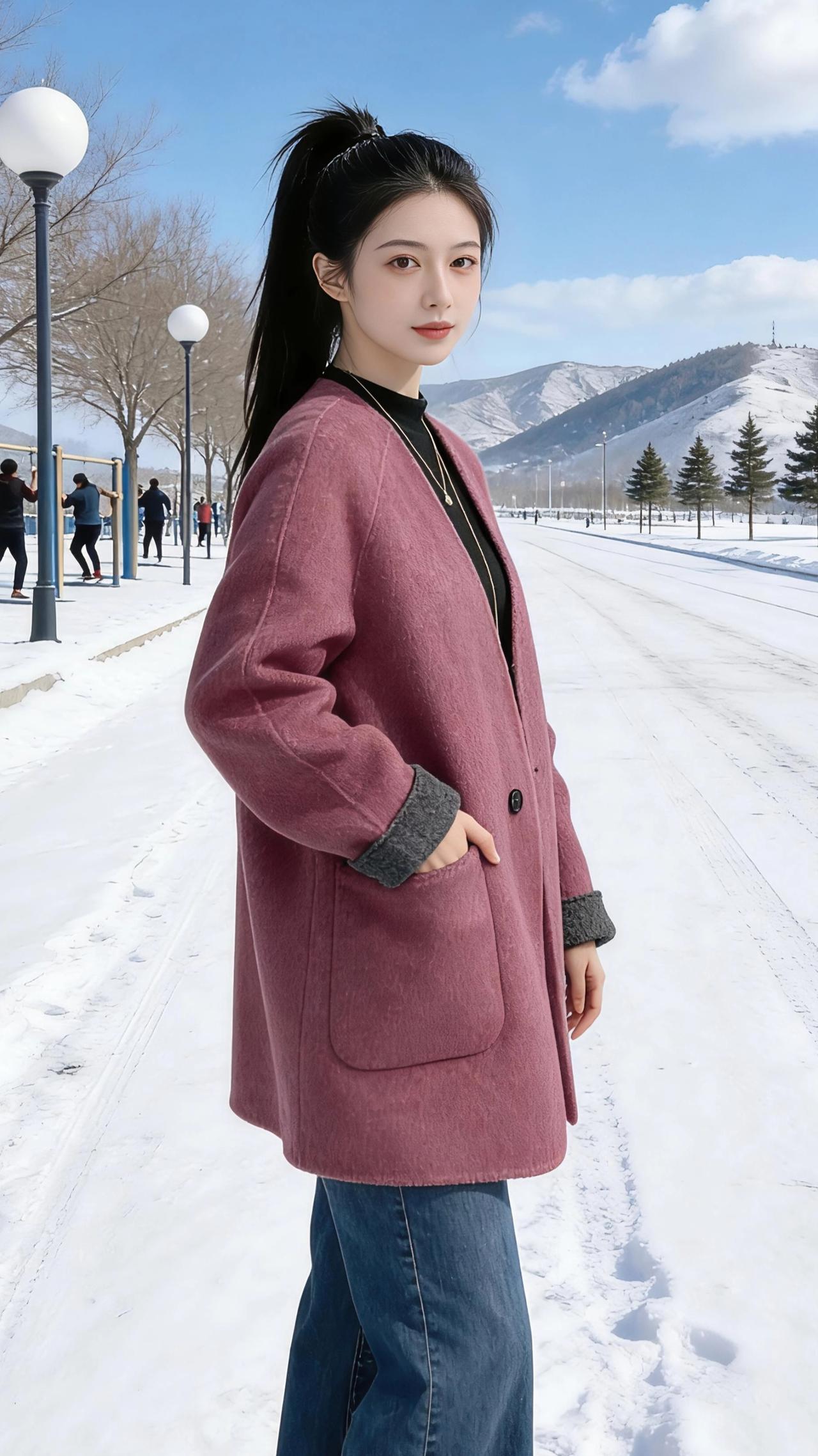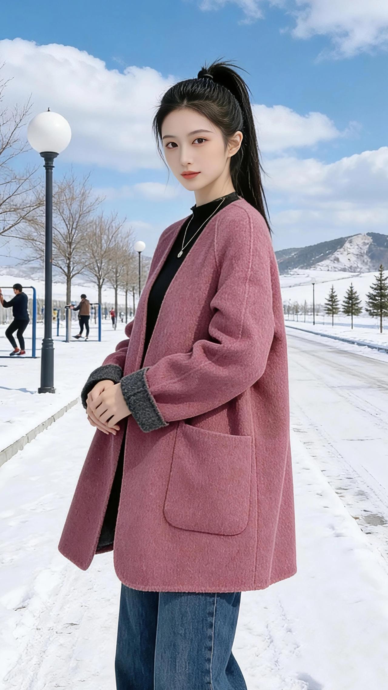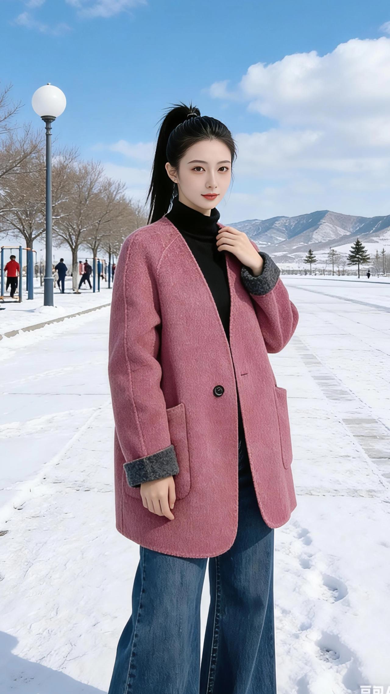粉黛与雪色 雪把远山染成素白的诗行,风里裹着清冽的寒,却被她身上的粉黛大衣轻轻揉软。那抹温柔的粉,像冬阳下初融的樱色,在一片素净里漾开,把凛冽的冬意都酿成了暖。 她的高马尾在风里轻晃,发梢沾着细碎的雪光。有时将手插进大衣口袋,指尖触到羊毛的绒暖;有时轻轻拢一拢衣襟,让暖意裹住肩颈;有时只是静静站着,目光掠过远处健身的身影,也掠过雪地上延伸的车辙。 两旁的路灯是圆润的白,像被时光擦亮的珍珠,顺着雪路一直排到山脚下。远处的山峦覆着薄雪,几棵青松在风里立着,像墨色的标点。她站在这雪与山的交界,把冬日的清寒,都酿成了温柔的风景。 高级感穿搭 时尚穿搭 冬季穿搭 羊毛外套