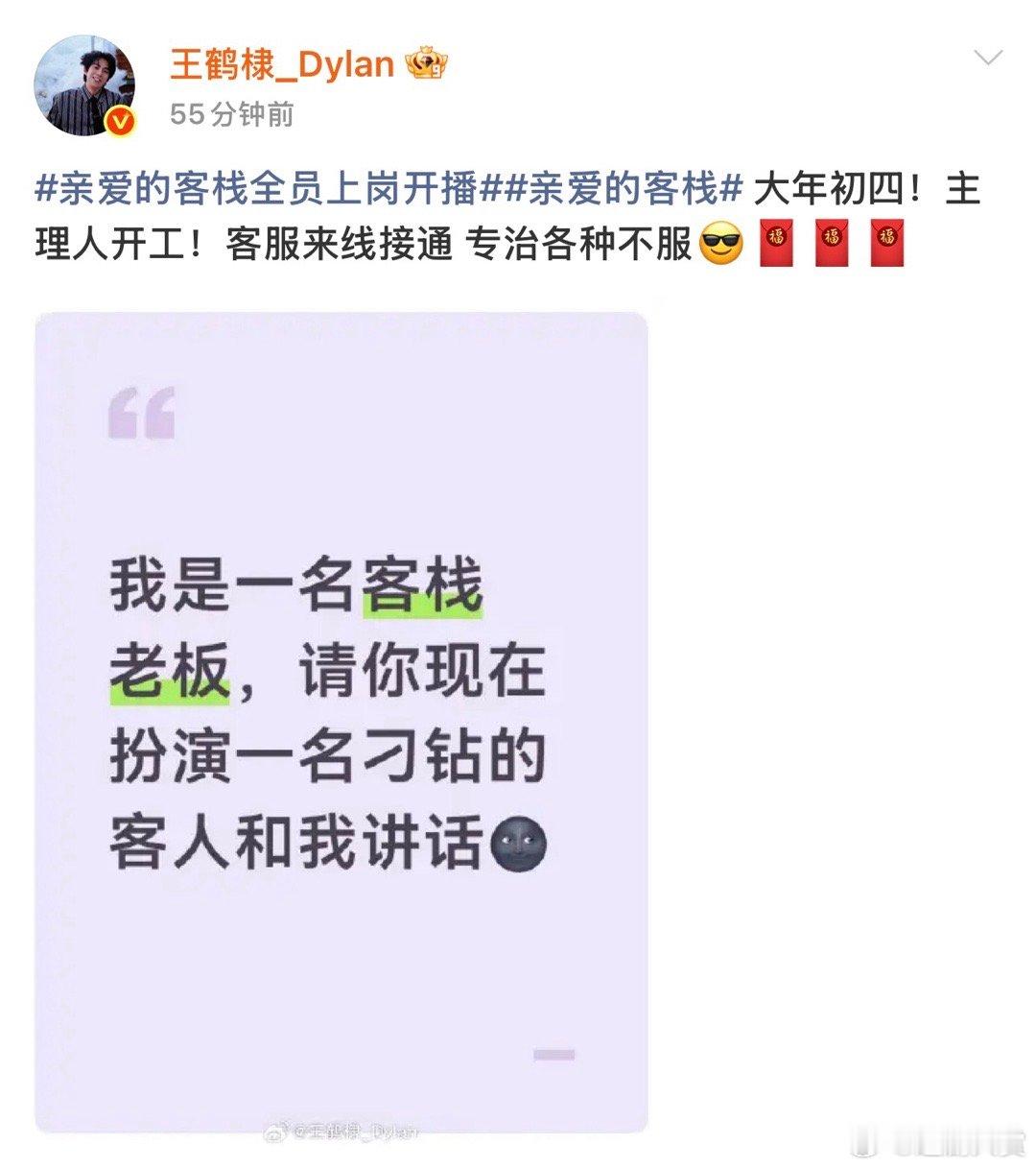 王鹤棣大年初四开工客栈主理人王鹤棣大年初四开工啦!请扮演一名刁钻的客人,用语言