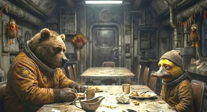 这部名为《感恩节》的短片由哈萨克斯坦导演伊戈尔·阿尔费罗夫利用Gemini 3.1等AI工具创作,讲述了一只熊和它的鸭嘴兽助手乘坐“垃圾桶”飞船在银河系穿梭的讽刺故事。