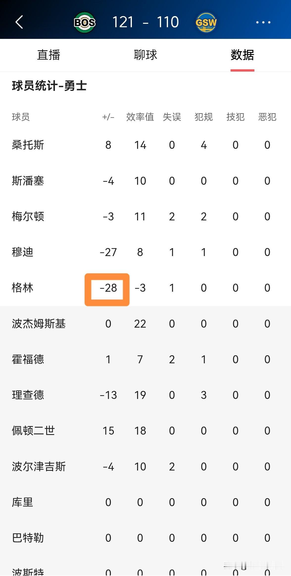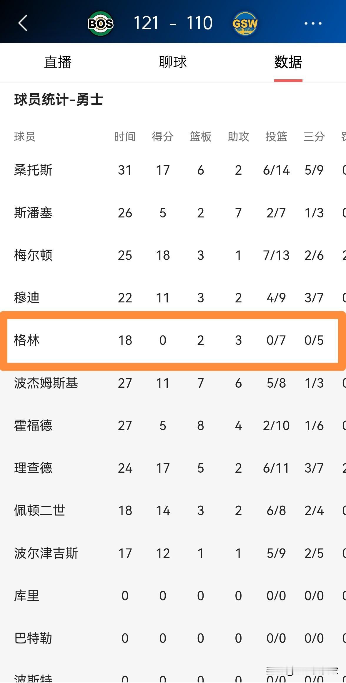 勇士老将追梦格林真是让人感到崩溃!在今天勇士主场以110:121不敌凯尔特人的比赛中,追梦格林的表现真是惨不忍睹,让人感到非常的崩溃! 全场比赛下来,追梦格林首发出战18分钟,投篮7中0怒砍0分,他的场上正负值为全队最低的-28。 我相信当勇士的主场球迷看到追梦格林的表现后,他们同样会感到崩溃。