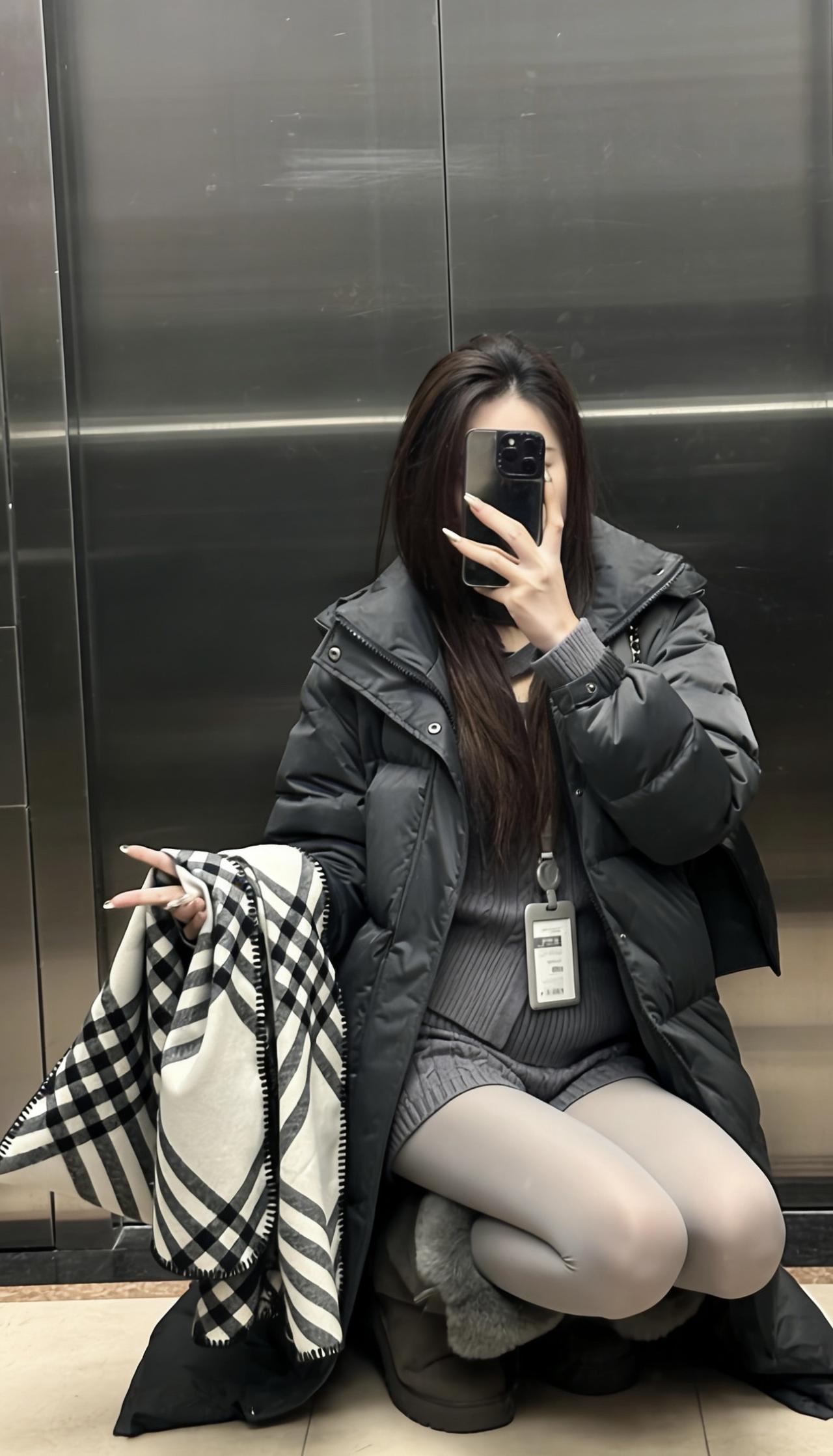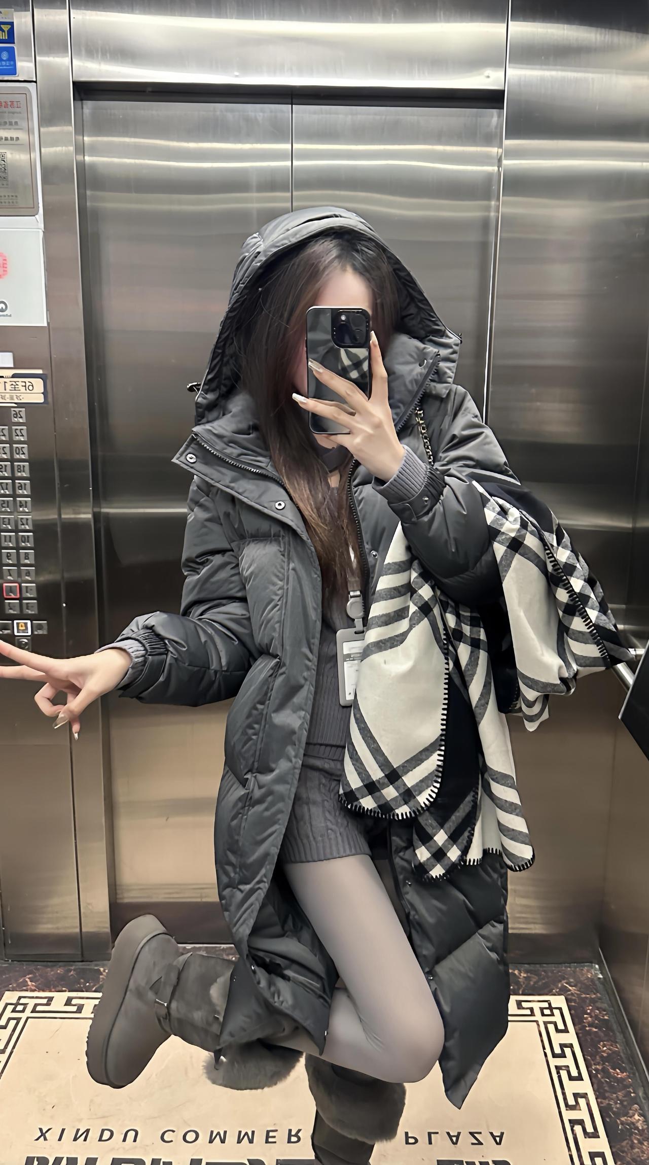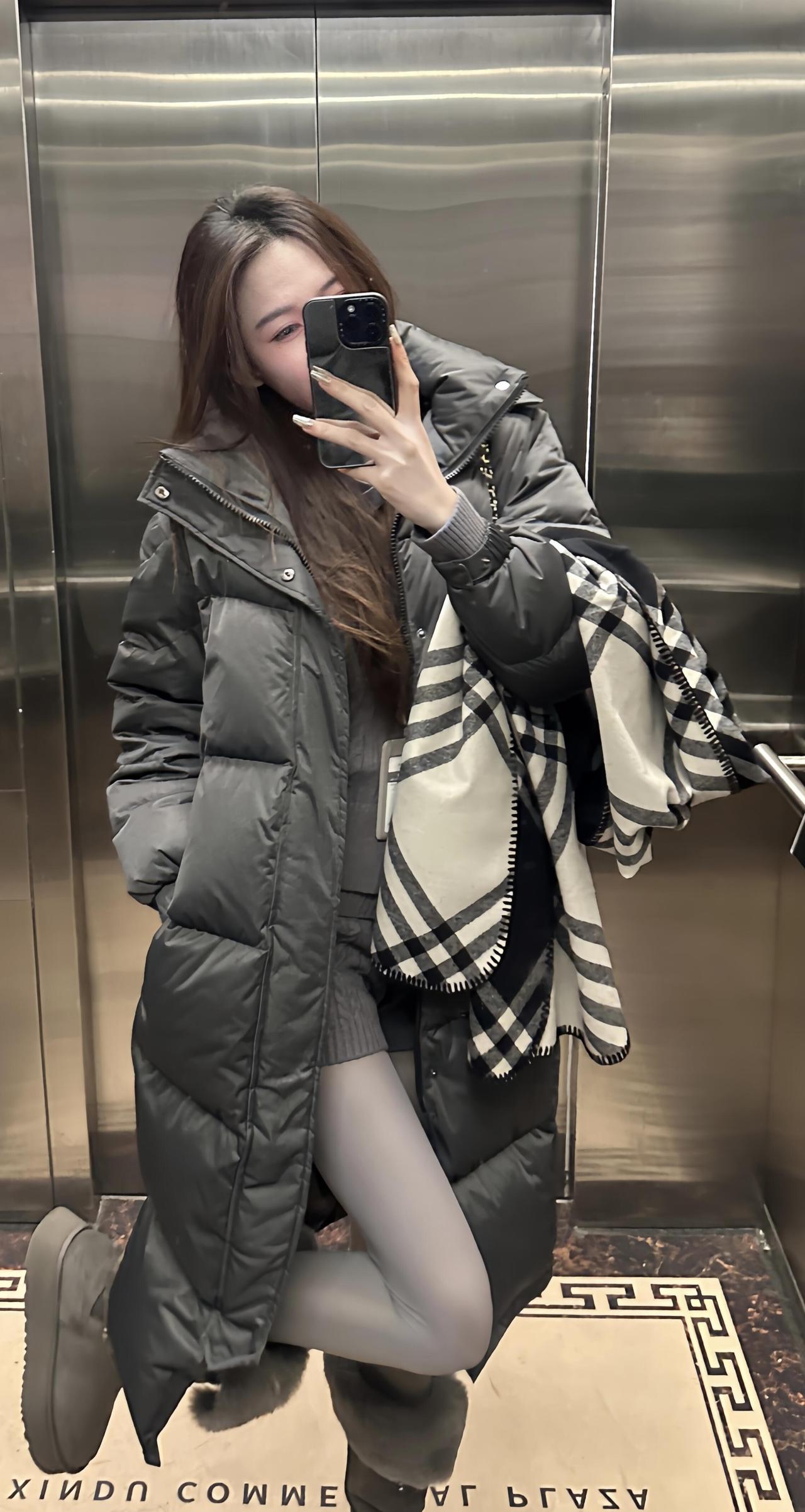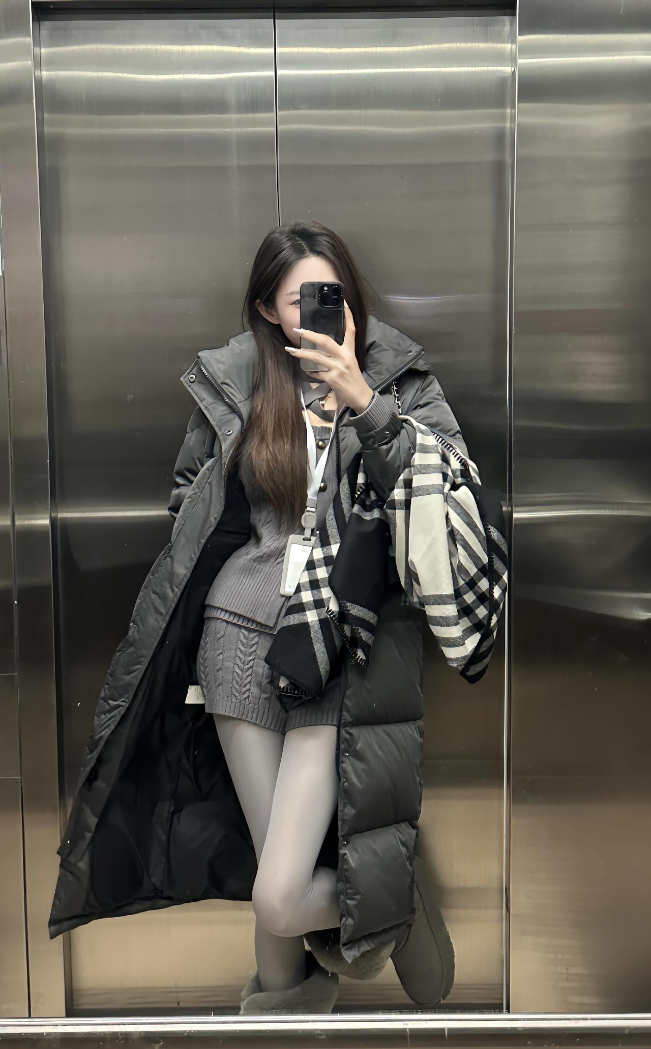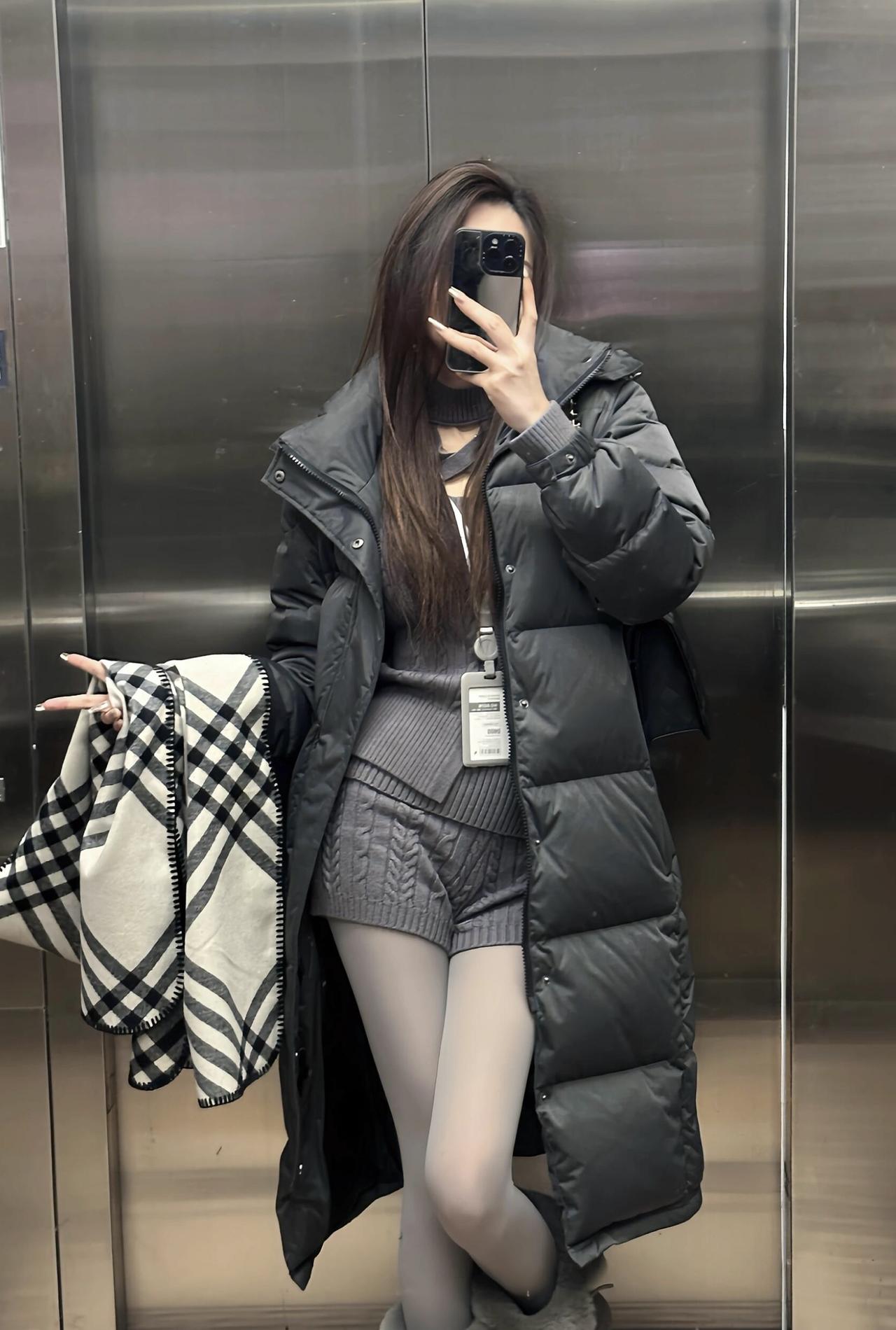 这套穿搭是冬日甜酷风的代表,兼顾了保暖与时尚感: •外套:深灰色长款羽绒服,