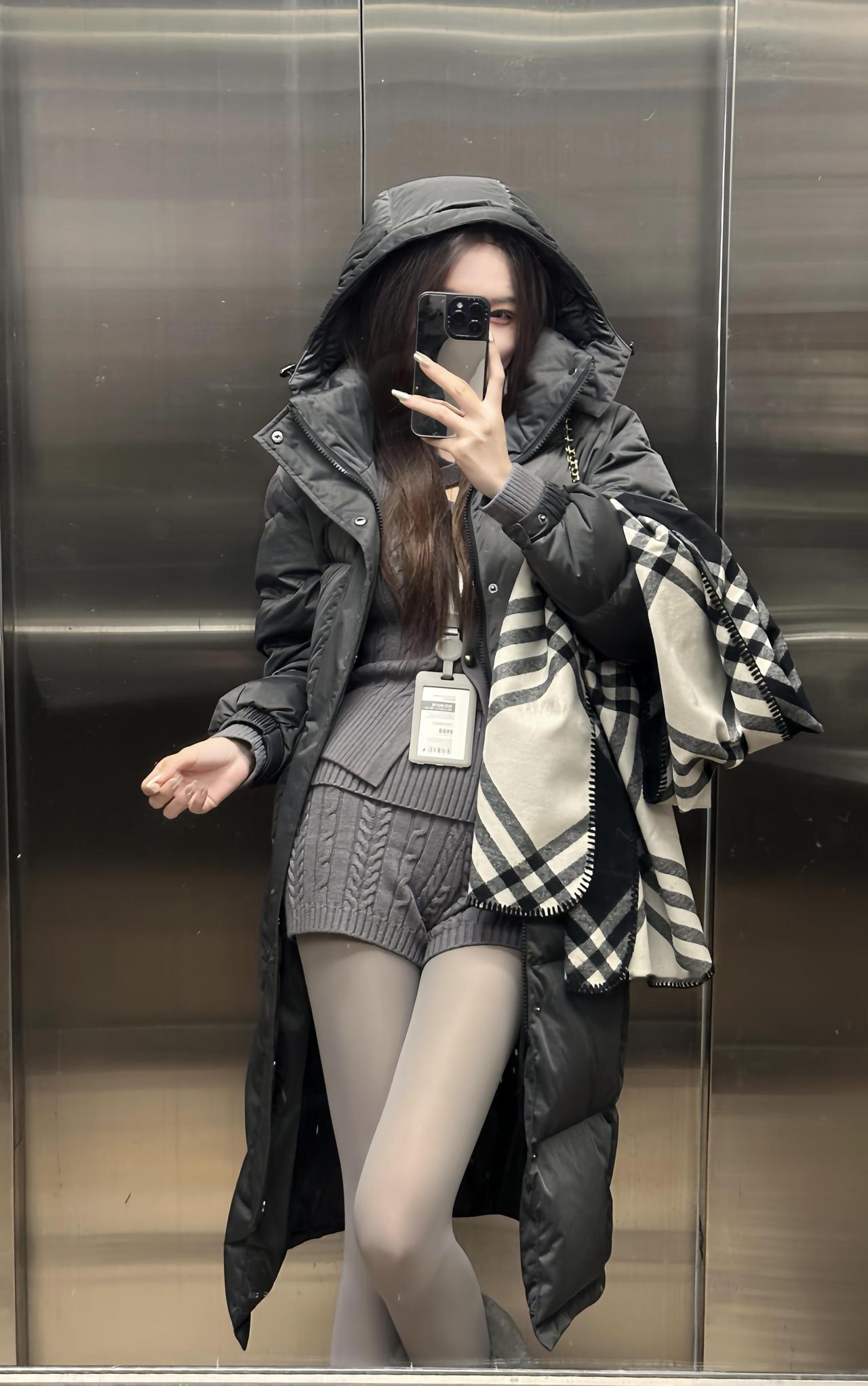 这套穿搭是冬日甜酷风的代表,兼顾了保暖与时尚感: • 外套:深灰色长款羽绒服,宽松版型和连帽设计能有效抵御寒冷,哑光面料低调又有质感,长度到小腿,既显气场又能包裹住大部分身体。 • 内搭:灰色针织套装(上衣+短裤),采用绞花针织工艺,修身剪裁凸显身材曲线,同色系搭配让整体造型更协调,同时中和了羽绒服的厚重感。 • 下装:浅灰色连裤袜,柔滑亲肤,与内搭颜色呼应,让腿部线条更流畅,也增加了穿搭的层次感。 • 鞋履:灰色厚底雪地靴,毛绒边设计增添了冬日氛围,厚底既显高又能保暖,与整体色调统一。 • 配饰:黑白格纹大围巾,作为视觉亮点打破了全灰的沉闷,既可以保暖,也能作为造型的装饰;搭配简约的黑色链条包,提升了精致度。 这套穿搭的适配性很强,主要适合以下场景: 1. 日常通勤/上学:羽绒服保暖性强,针织套装舒适得体,整体风格干练又不失时尚,非常适合需要兼顾温度与风度的日常场景。 2. 城市休闲出行:比如逛商场、咖啡馆小坐、和朋友逛街,既不会显得过于正式,又能在冬日里保持精致。 3. 短途旅行/探店:舒适的雪地靴和保暖的羽绒服,能应对冬日户外的温度变化,同时上镜效果很好,适合拍照记录。