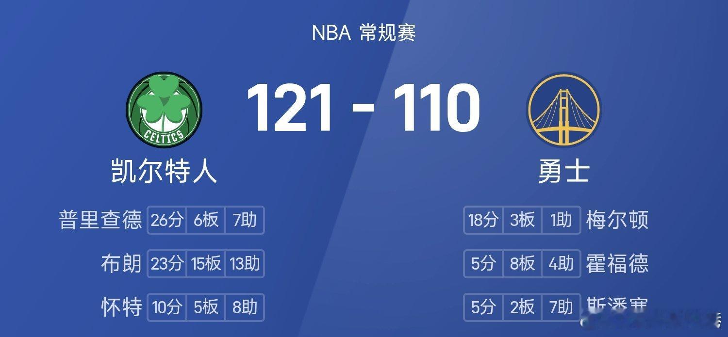 凯尔特人vs勇士nba 勇士108-121不敌凯尔特人。普里查德砍下全场最高的26分6板7助,布朗砍下三双率领凯尔特人成功取胜。