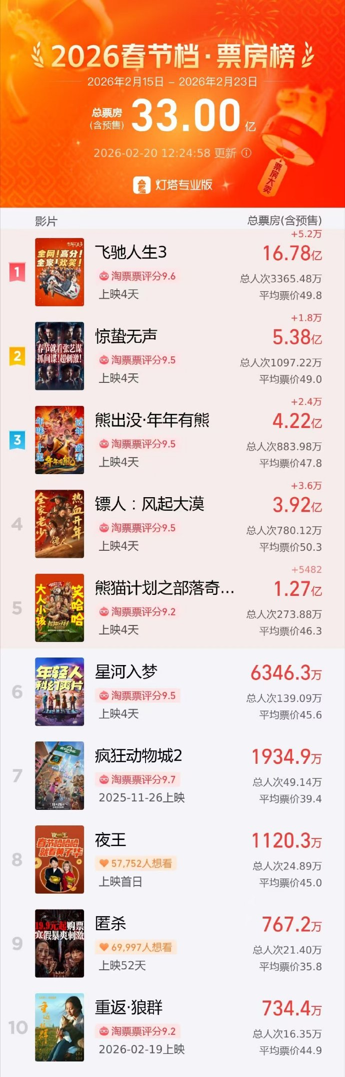 【春节档总票房突破33亿】飞驰人生3领跑据“灯塔专业版”微博,截至2月20日12时24分,2026春节档(2月15日-2月23日)档期总票房(含预售)突破33亿元。 其中《飞驰人生3》领跑档期,这个春节,你看了哪部电影?