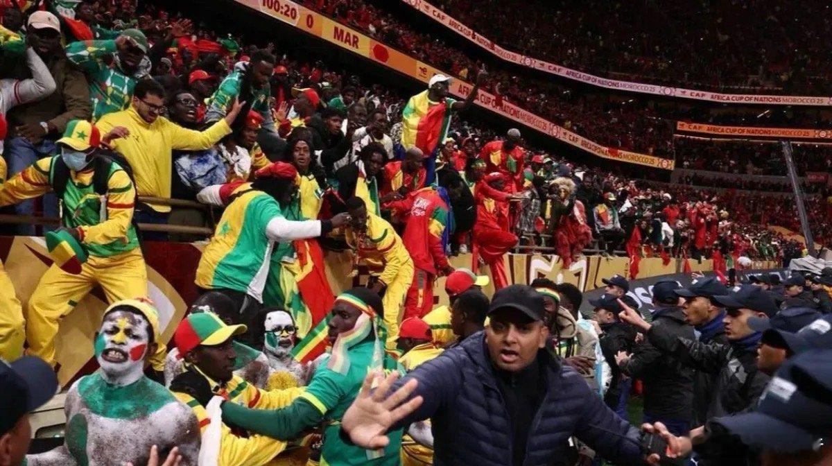 在这场塞内加尔1-0击败摩洛哥的决赛中,塞内加尔球迷因主队遭遇不公判罚而冲入球场袭击安保,据报道甚至有一名工作人员遭袭击被担架抬离场外。