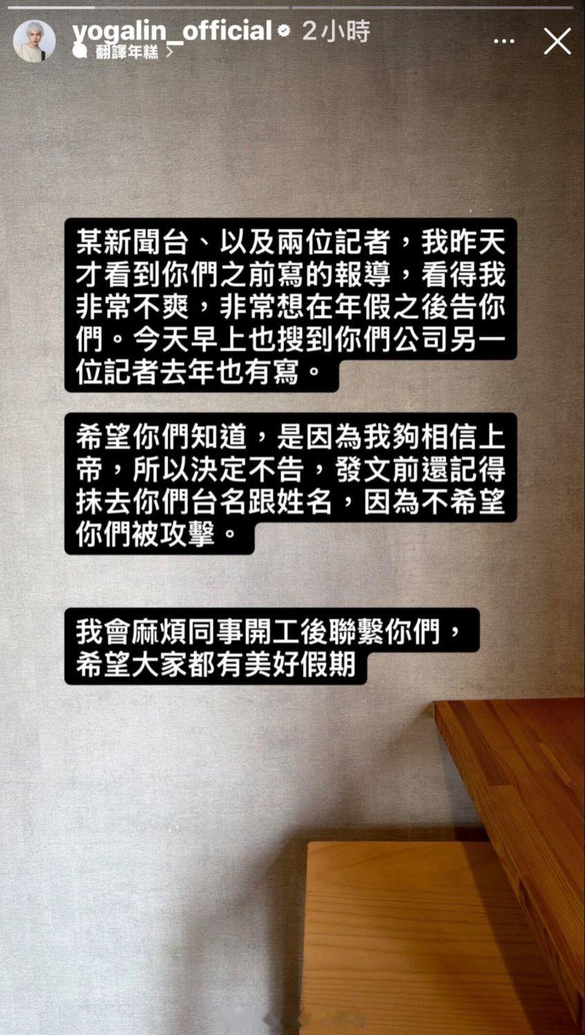 对此,林宥嘉很不满,发文表示:看到你们的报道,我很不爽。在休假结束,开工后,我会让同事联系你们。