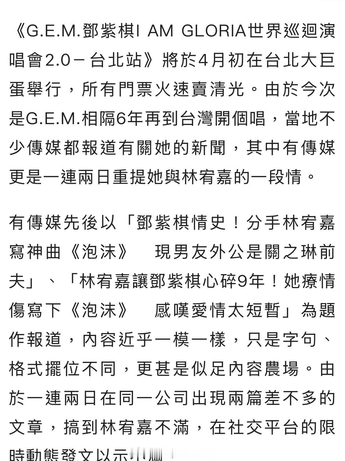 最近,邓紫棋要在台北大巨蛋开演唱会,很多媒体报道时,提起她和林宥嘉的过往情史,表示他曾让邓紫棋心碎。