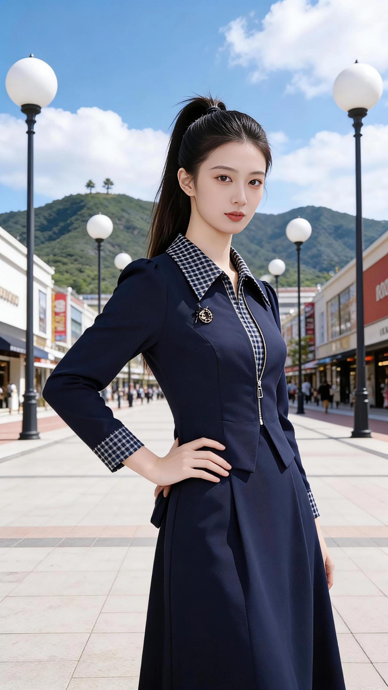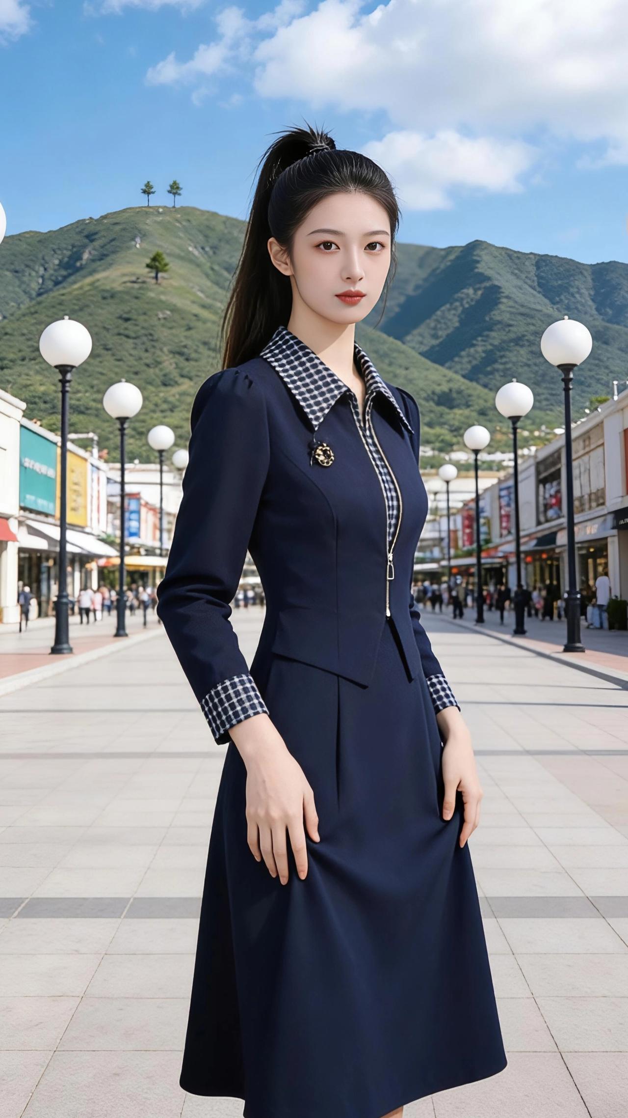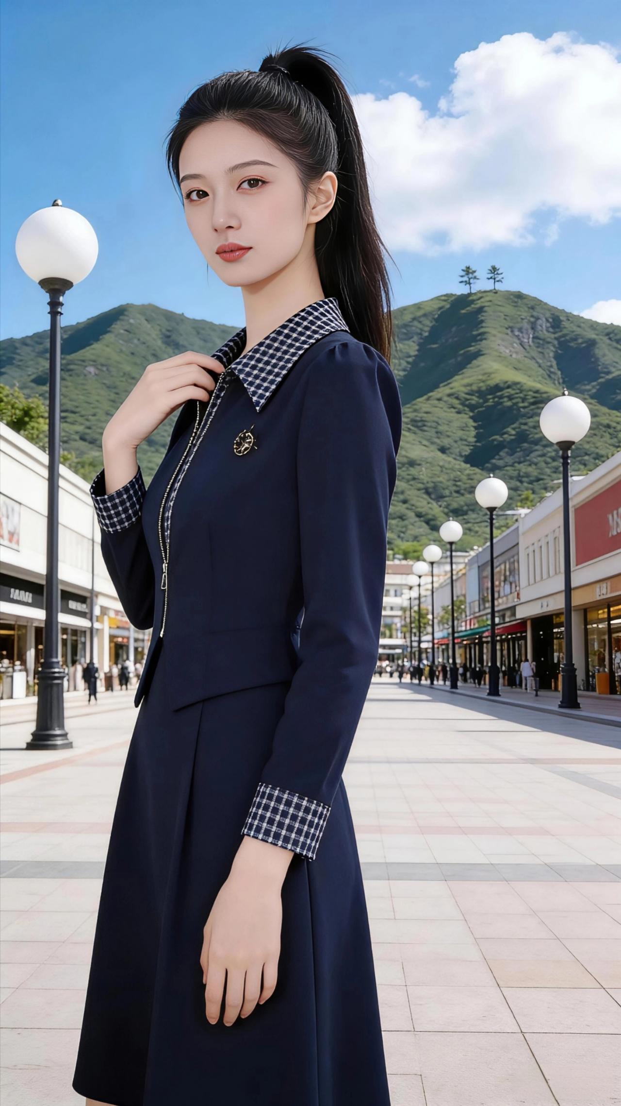 藏青的裙裾在风里漾开,像把远山的黛色都缝进了衣料。她站在商街的中央,格纹翻领与金属拉链在阳光下泛着细亮的光,胸针的纹路静静卧在衣襟,像一枚被时光珍藏的星。 高束的马尾垂落几缕碎发,耳坠的珍珠随着脚步轻轻晃。她有时抬手理一理翻领,指尖掠过格纹的肌理;有时轻轻提起裙摆,让风钻进布料的褶皱;有时只是安静地站着,目光掠过两侧的商铺招牌,也掠过远处青山的轮廓。 街两旁的路灯是圆润的白,顺着方砖路一直排到山脚下,像一串被擦亮的珍珠。远处的青山在云影里起伏,几棵小树站在山尖,像被风遗落的墨点。她站在这人间烟火与自然青山的交界,把都市的精致,都酿成了温柔的诗行。 高级感穿搭 时尚穿搭 早春穿搭