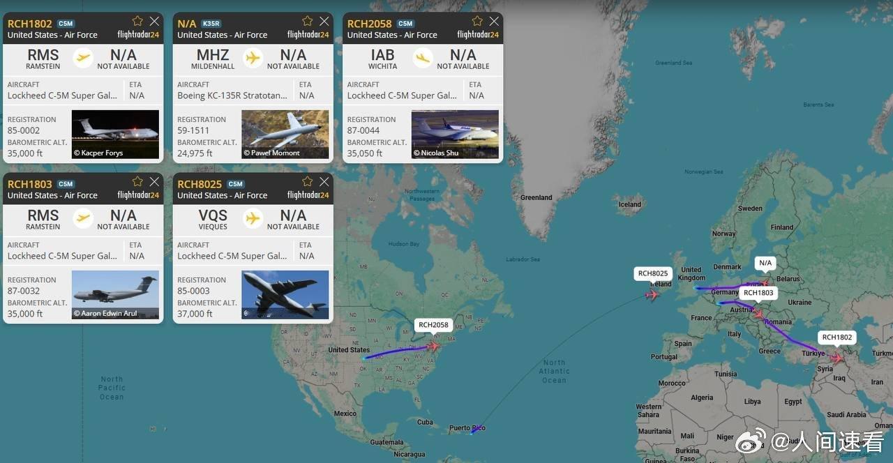 美国空军的三架C-5M“超级银河”战略重型运输机目前正在欧洲上空同时飞往中东地区,而第四架飞机则正准备跨越大西洋。