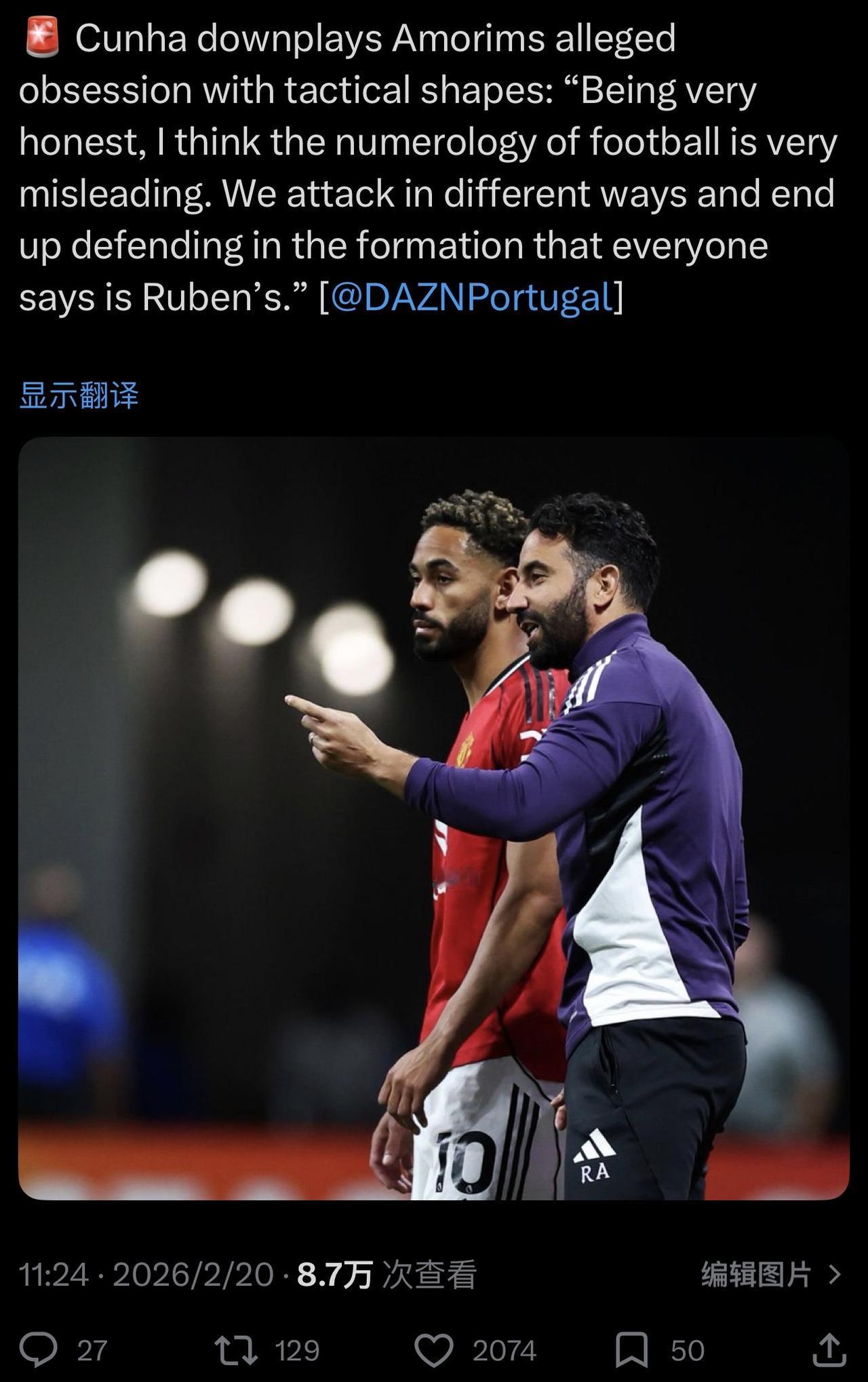 阿莫林就是太执著,非要站死3个中卫,而2个边翼卫又非要进攻能力大于防守能力。 把战术阵型用的死板得很…… ……………………………………………………………… 库尼亚淡化了阿莫林对战术阵型的痴迷:“说实话,我认为足球的阵型学非常具有误导性。我们进攻的方式多种多样,但最终防守时用的却是大家口中鲁本的阵型。” [ @DAZNPortugal ]