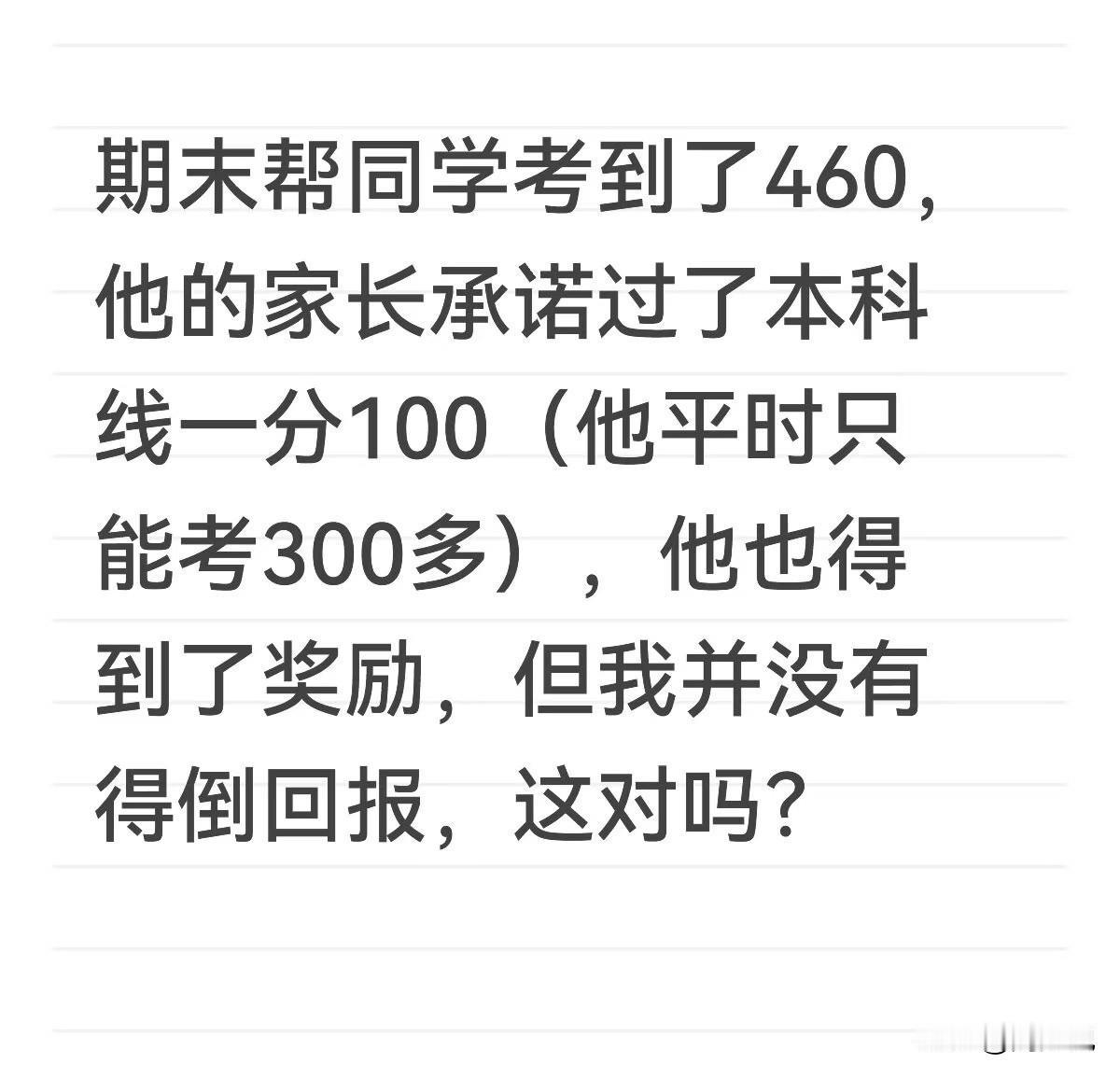 “确实寒心!”河北一名学生发帖吐槽,自己期末帮同学考到了460分,远超对方平时三百多分的水平,顺利过了本科线。此前同学家长说好,过线一分给10块钱奖励,如今同学拿到了钱,自己却一分回报都没得到。 更让人心寒的是,为了帮对方,他全程手抄答案,同学答题卡写什么,他就原封不动抄一份,等于一场考试写了两份卷子。不光是期末,平日里的月考,他也次次出手相助。 他坦言:“自己不差钱,手里也有三千多积蓄,可这份不被珍惜、不被兑现的承诺,真的让他觉得特别不值”。 此事一出,不少网友纷纷留言:“帮是情分,不帮是本分,对方这做法太不懂感恩了”。 还有网友更是坦言:“真心换不来真心,以后真的别再傻了”。 在周少看来,其实这件事,说到底不是钱的问题,而是真心被辜负。我们总说同学之间要互相帮助,可帮忙从来都不是单方面的消耗,更不是理所当然的索取。 你掏心掏肺付出时间和精力,甚至冒着风险帮对方过关,图的不是那几百块钱,而是一份尊重和惦记。可对方拿到好处后,就把承诺抛在脑后,连一句像样的感谢都没有,换谁都会心寒。 客观的说,及时止损真的不算错。善良要有底线,帮忙也要分人,别让自己的好心,变成别人随意利用的工具。 真正的情谊,从来都是双向奔赴,而不是一个人默默付出,另一个人坦然接受。希望我们都能守住自己的善良,把真心留给值得的人。#寻美三湘#