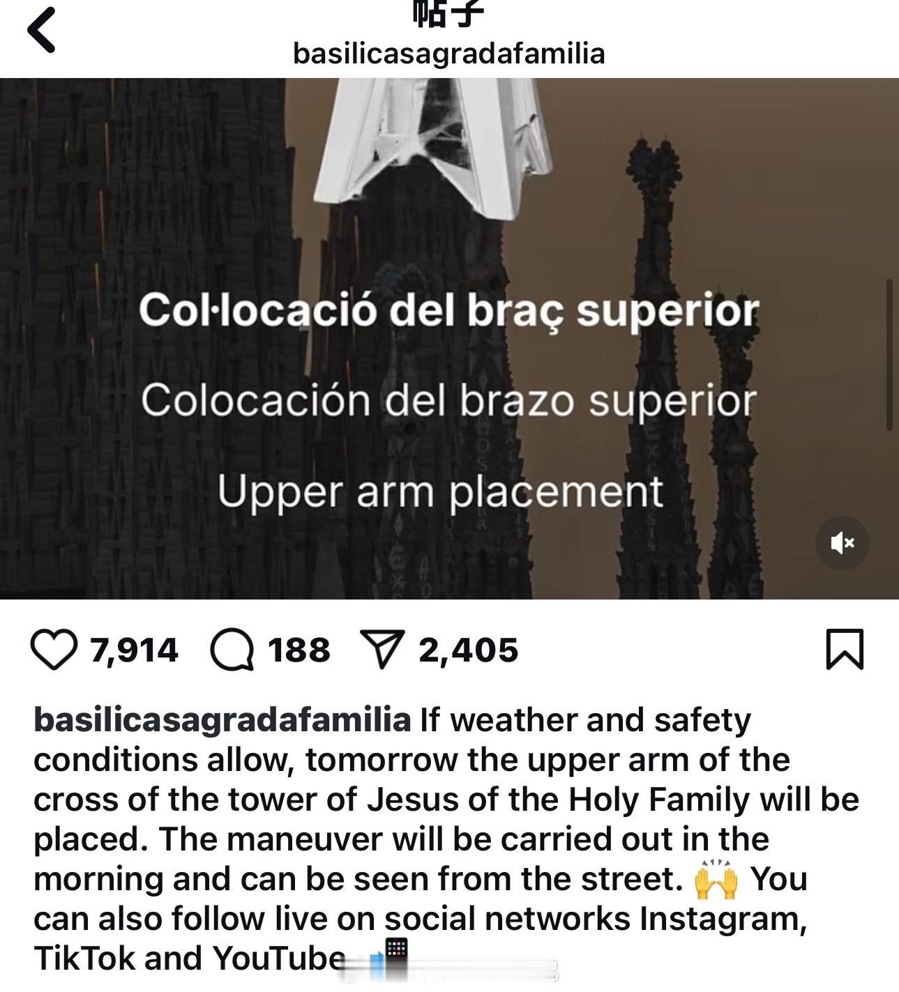 圣家堂的官方ins已经发布消息,明天早上(北京时间今晚)将放置十字架,也就是圣家堂的顶部。至此,这栋建造144年的建筑已经封顶了(今年是高迪逝世100周年)