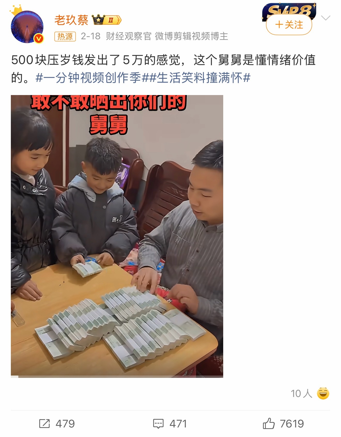 500块压岁钱发出5万的感觉其实发这种孩子最喜欢,可以自己留着花,因为100一张的父母会替他保管,10块、1块一张的可以自己保管,就这种面额的孩子才实用呢,孩子不用上交了,可以买零食