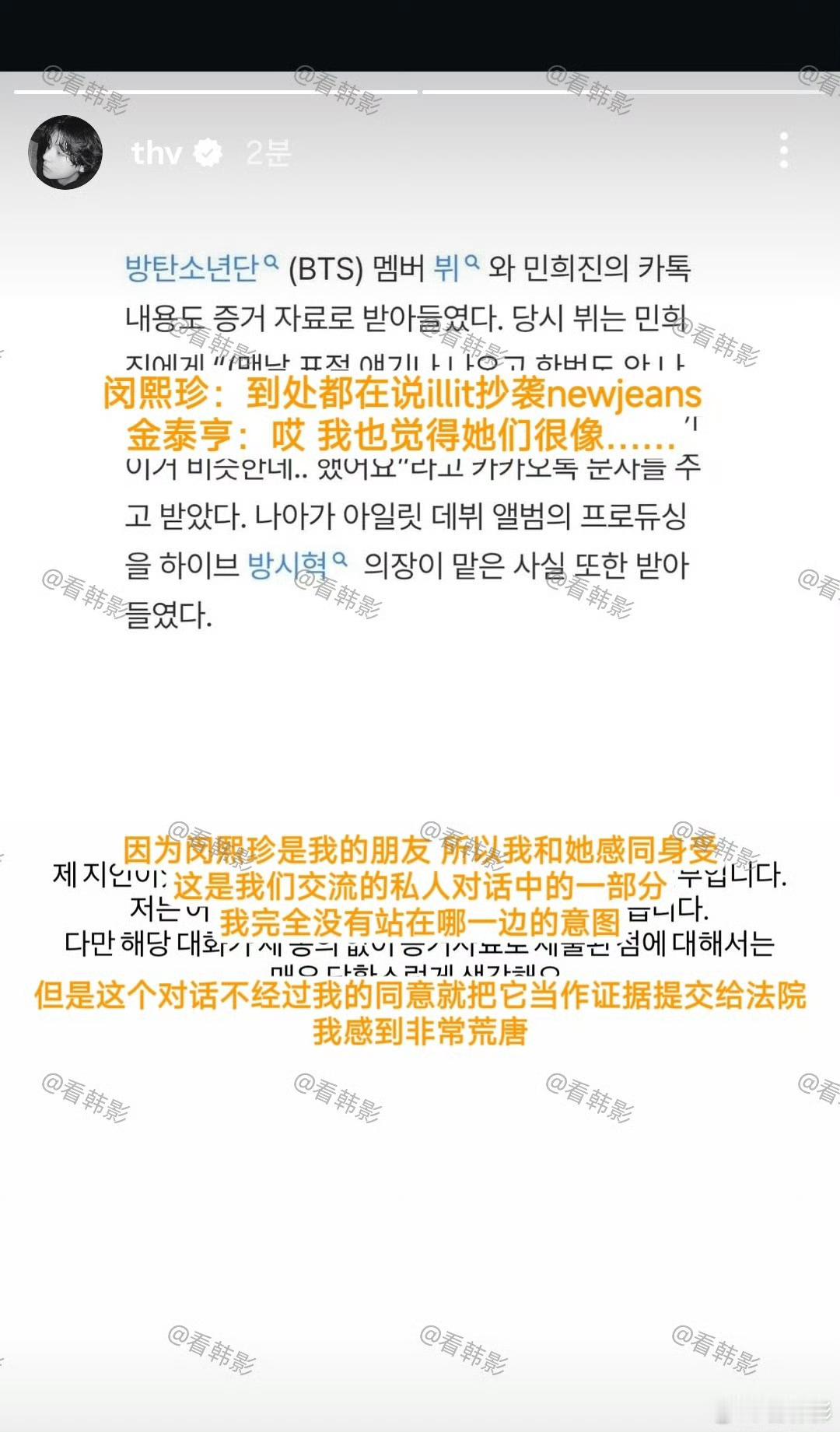 闵熙珍这算不算背刺啊,当你是朋友才顺着你的话说两句,结果被你当成证据提交了金泰亨说illit像newjeans