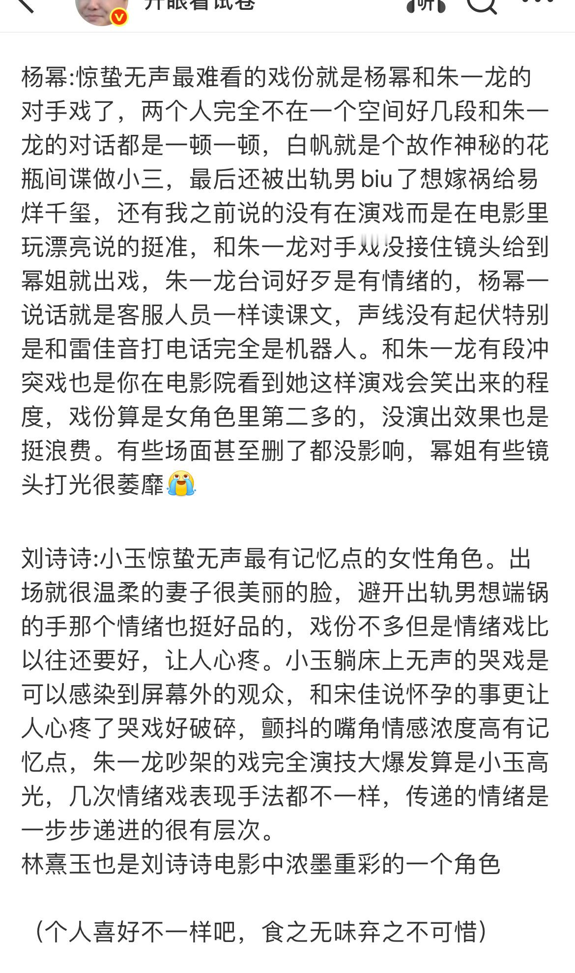 《惊蛰无声》这个观后感,看着很真实,刘诗诗真的刷到都是好评哎,客串角色能演的这么