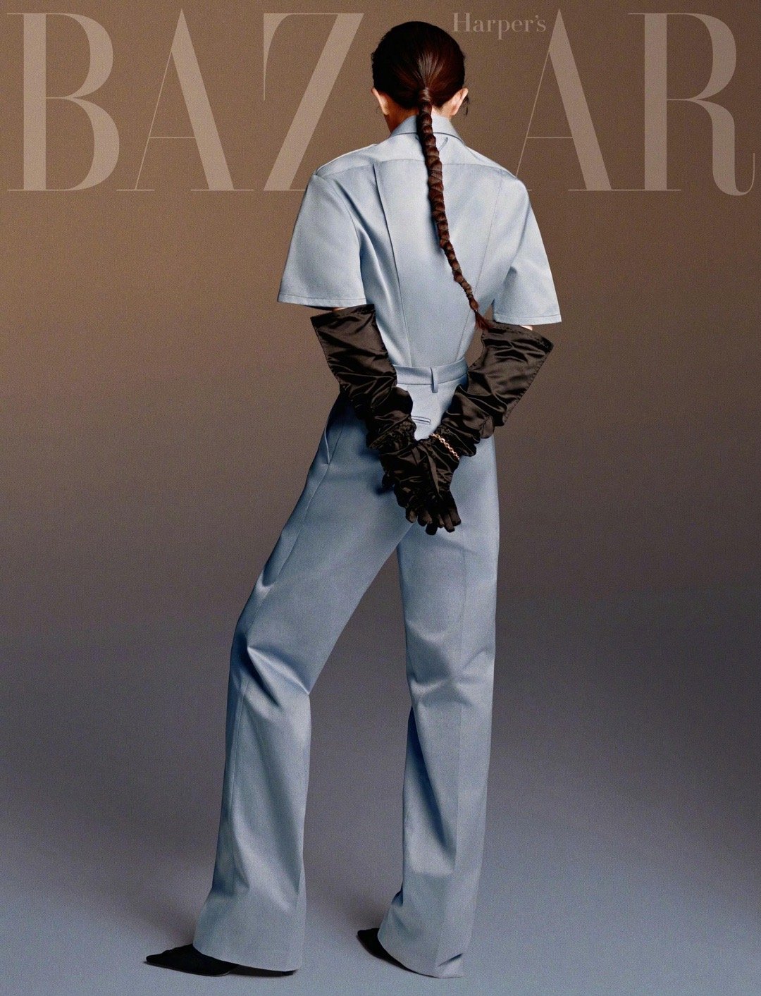 杨幂《时尚芭莎》三月开季刊封面预告来咯!Prada浅蓝短袖连体裤搭配黑色缎面长手套,利落剪裁勾勒飒爽气场