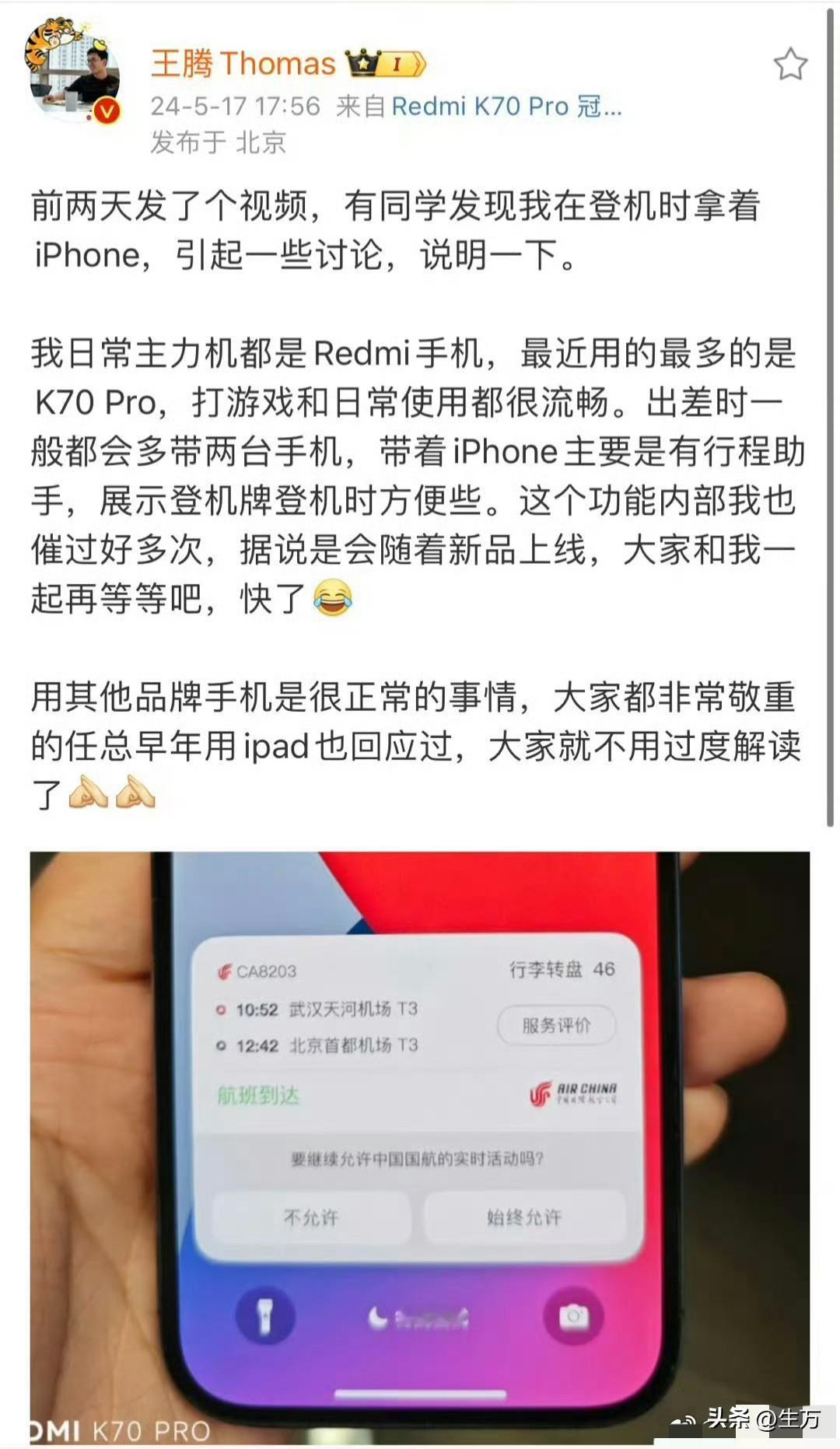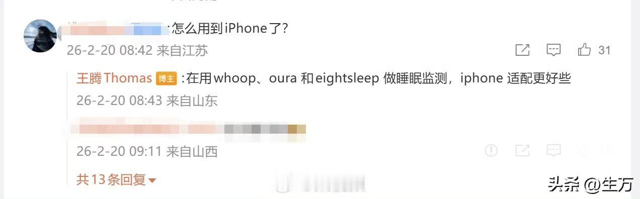 王腾回应换iPhone17! 虽然今天才大年初四,但是王腾早就在上班了,因为他做这个睡眠产品经常要做与眠有关的测试活动,所以看起来他的工作比较的积极,因为要用到各个测试软件,所以有细心的朋友发现,他在社交网络用的手机不再是小米而是苹果了! 作为小米曾经的产品经理,这才离开小米半年左右的时间,就不用自己的产品了,所以有网友在评论区问他为什么要这样,他看起来也十分敞亮,直接说他用iPhone的根本原因就是,相关的测试软件用起来更加的适配[捂脸] 那如果反向理解的话,是不是小米手机用这些软件就不是特别的适配,估计现在他没有时间去考虑这些事情,因为已经有资本给他投钱做这个事情了,所以他现在当务之急是,要尽快的把自己这个产品相关的软件给调配好,而且要尽快的上市,还得做出差异化,关键要有用户买单才行。 所以估计他现在已经感觉到了,自己创业与在大厂当经理还是有本质上的不一样,也许现在他站在创业者这个角度,才更能看清楚哪些东西真的好用,哪些东西用户基数不但大,而且稳定。