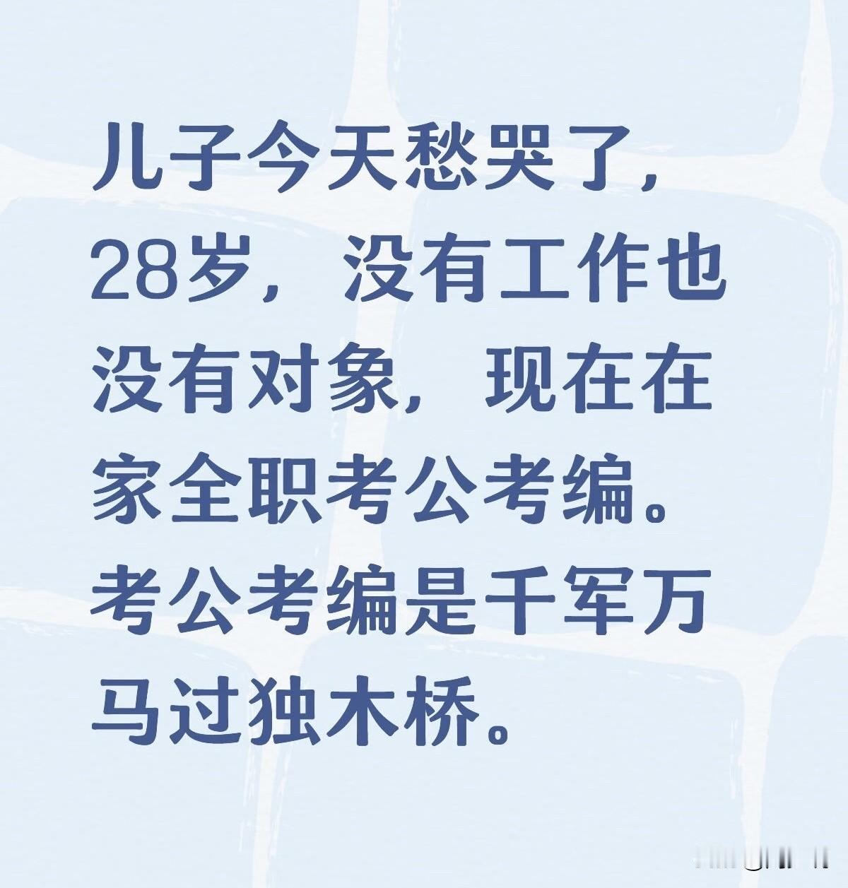 “妈,我是不是特别没用?”江西一位妈妈深夜发文,28岁儿子全职考公考编,接连遭遇岗位扎堆竞争,终于在书房里绷不住哭了,这一幕戳中无数家长的心。 儿子重点大学毕业,放弃企业offer一心冲体制内,辞职在家备考近一年。省考一个岗位挤130多人,他差3分惜败;如今报事业编,个位数岗位依旧百人报考,还没开考就先泄了气。 妈妈端去他爱吃的炖排骨,撞见儿子趴在书桌前抹泪,申论试卷画满标记,眼睛肿成核桃。他自责在家“啃老”,看着同学买房成家,自己却困在考试里看不到希望,连头发都熬出了白丝。 这事在网上传开后,引发网友热议。不少网友纷纷破防:“太真实了,谁家孩子不是拼尽全力,考编真的不是努力就有结果”。 还有网友坦言:“父母的包容才是孩子最大的底气,千万别逼太紧”。 其实在周少看来,考编这条路本就充满变数,从来不是只靠努力就能稳稳上岸。年轻人追求稳定没错,但一味把所有希望押在一场考试上,难免会被压力压垮。 28岁的年纪,有冲劲、有学历,即便暂时没走进体制内,也未必就是失败。 作为父母,能做的不是催促,而是像这位妈妈一样,守住一碗热饭、一句安慰,给孩子留好退路。不妨也劝劝孩子,不必死磕一条路,人生的选择从来不止一种,尽力而为,比硬撑着追求一个结果,更重要。 别让“稳定”困住了年轻的脚步,哪怕走慢一点、绕一点弯路,只要不放弃,总能找到属于自己的位置。#寻美三湘# #周少说教育#