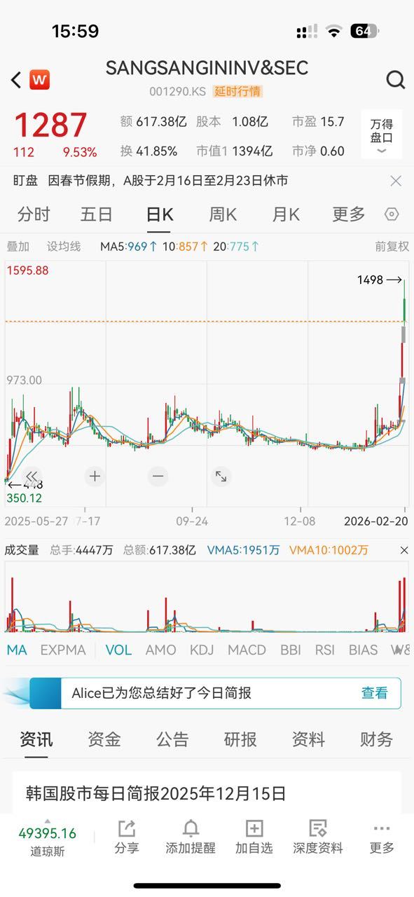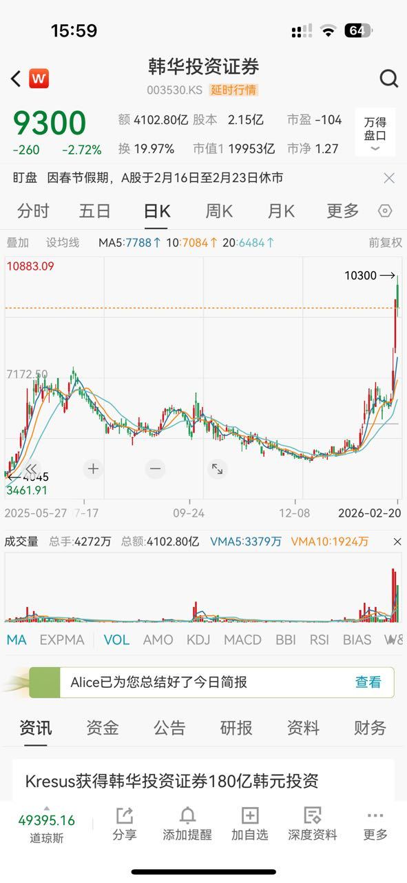 韩国春节后第二天,券商股挺稳。
