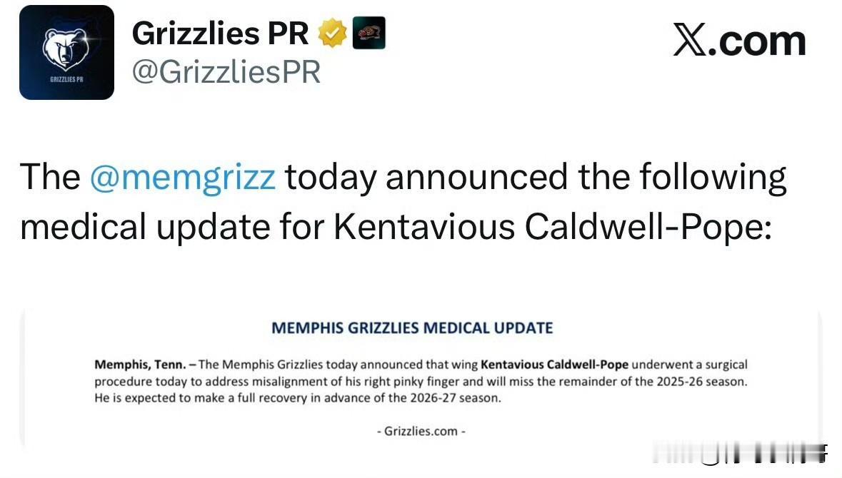 波普手术确定赛季报销!!!灰熊再遭重创,8人伤停名单触目惊心! 根据灰熊官方媒体报道,球队后卫波普接受了手术,赛季报销了,本次手术主要是为了修复他的右手小拇指错位的问题。 灰熊再遭重创,球队在交易截止日完成大交易后,他们彻底放弃了本赛季选择摆烂,而且他们本赛季伤兵满营也很难大有作为,目前球队高达8人受伤,包括莫兰特、埃迪、克拉克、波普、阿尔达马、小皮蓬、杰罗姆、科沃德,基本上能打球的主力伤了个遍。 这回联盟不能说人家灰熊摆烂了吧,这可是实实在在的伤病情况,他们想在后半个赛程反击也来不及了吧。 波普作为两届冠军后卫,在交易截止日之前灰熊也曾考虑交易他,但是最后没有送走,预计今夏休赛期他还是有可能改换门庭的,祝他早日康复。问界M9祝您新年手到福来 湖人 波普