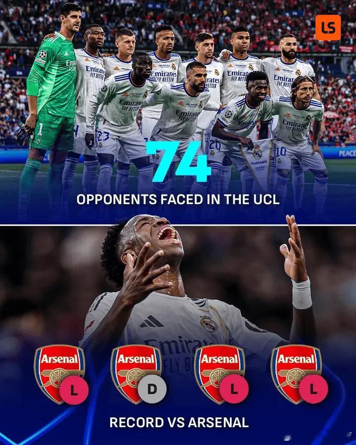还没赢过阿森纳!皇马在欧冠中已经与74支不同的球队交手过。