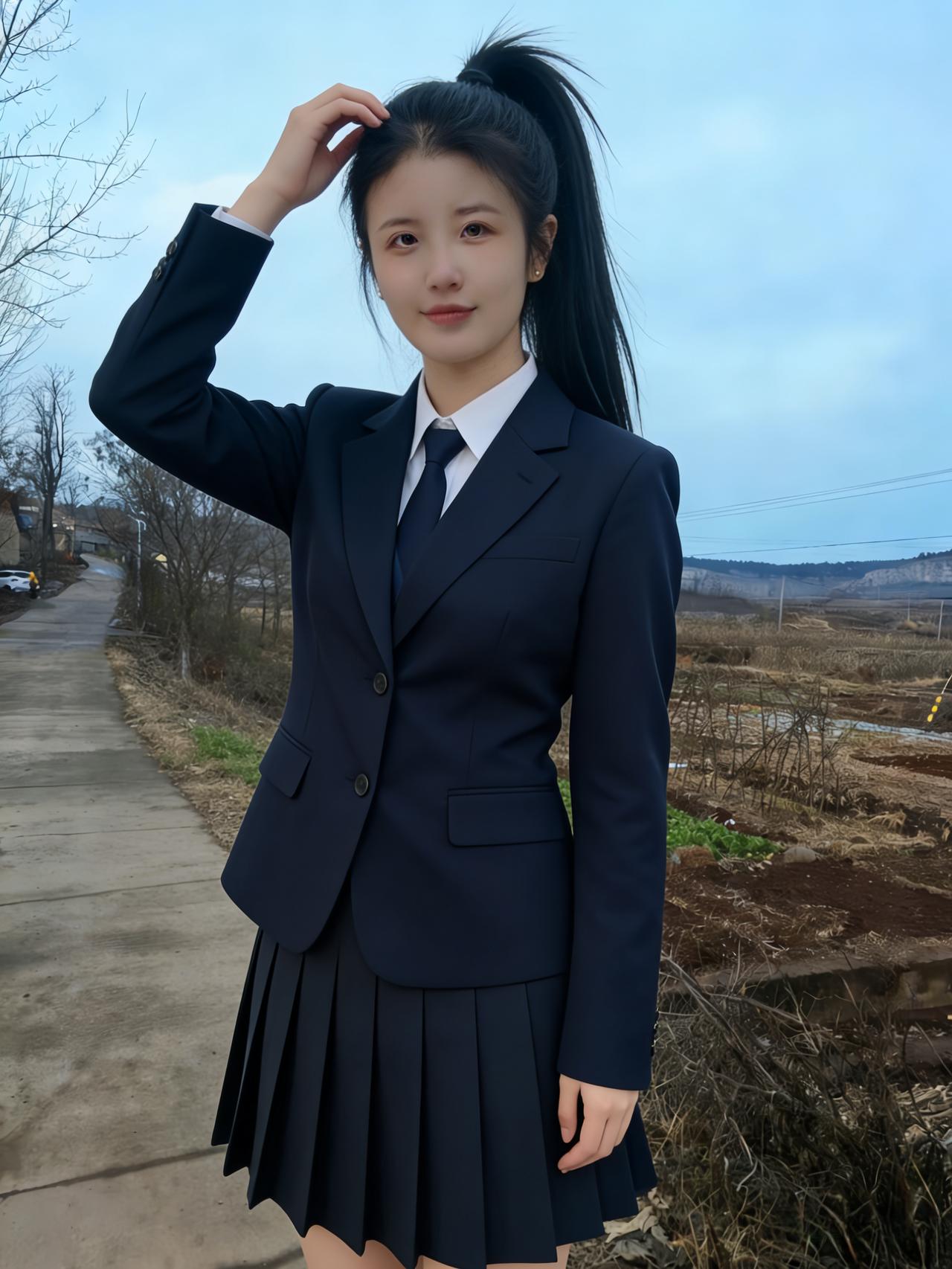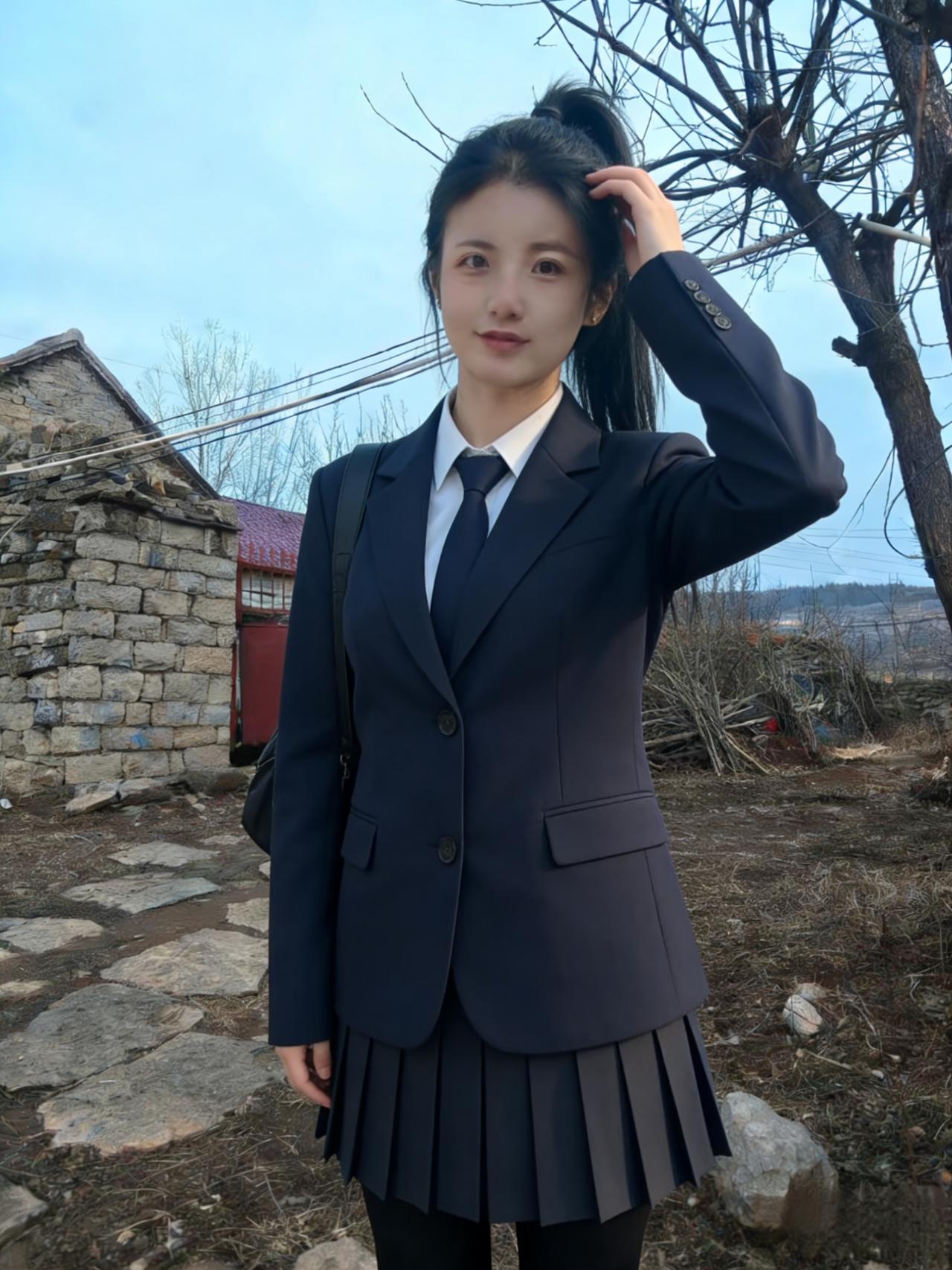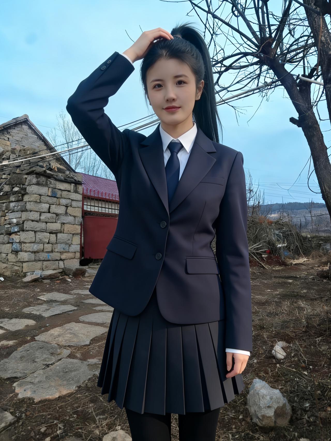 青石铺就的小径,延伸向远山的朦胧 枯树的枝丫,勾勒出浅蓝的苍穹 你侧身而立,马尾轻扬,自成一道风景 藏青的西装,裹着少女最清隽的骨相 ~ 侧脸的轮廓,柔和又利落 唇间噙着浅淡的笑意,温而不柔 指尖挽起垂落的发丝,动作轻缓 像挽起一段,不慌不忙的年少时光 ~ 红瓦石墙,是故乡最朴素的底色 荒草与碎石,铺着人间最真实的温良 你与这烟火乡野,相融又相衬 都市的利落西装,撞进山野的恬淡安详 ~ 没有霓虹璀璨,没有人海熙攘 只有晴空、老树、老屋,与你对望 眼眸清亮,盛着未被世俗沾染的光 百褶裙轻垂,藏着少女的柔软与倔强 风从田野来,拂过你的发梢与衣裳 把青春的模样,刻在这朴素的土地上 一抬首,一回眸,皆是不染尘的清朗 这人间的美好,大抵就是这般干净的模样