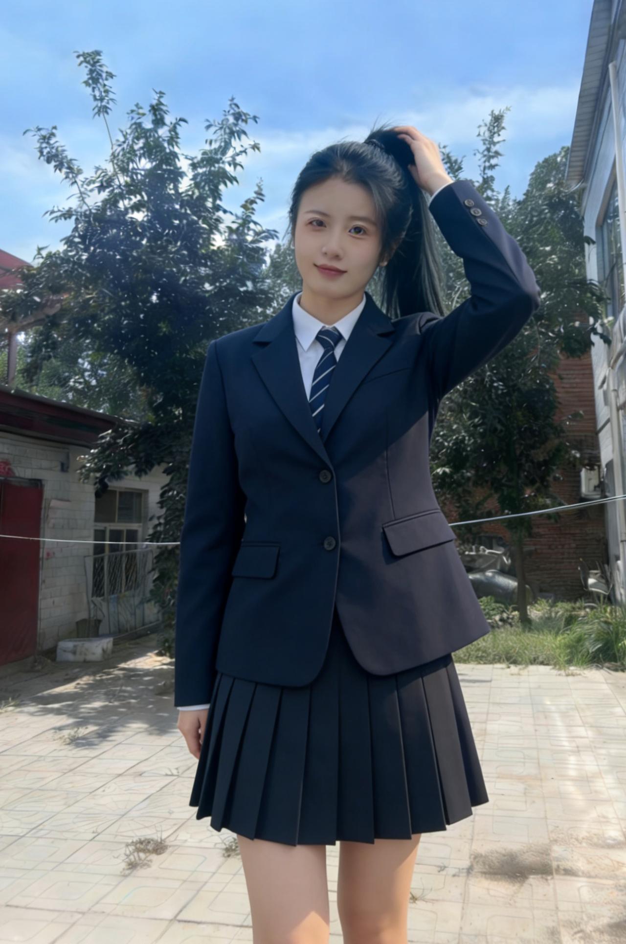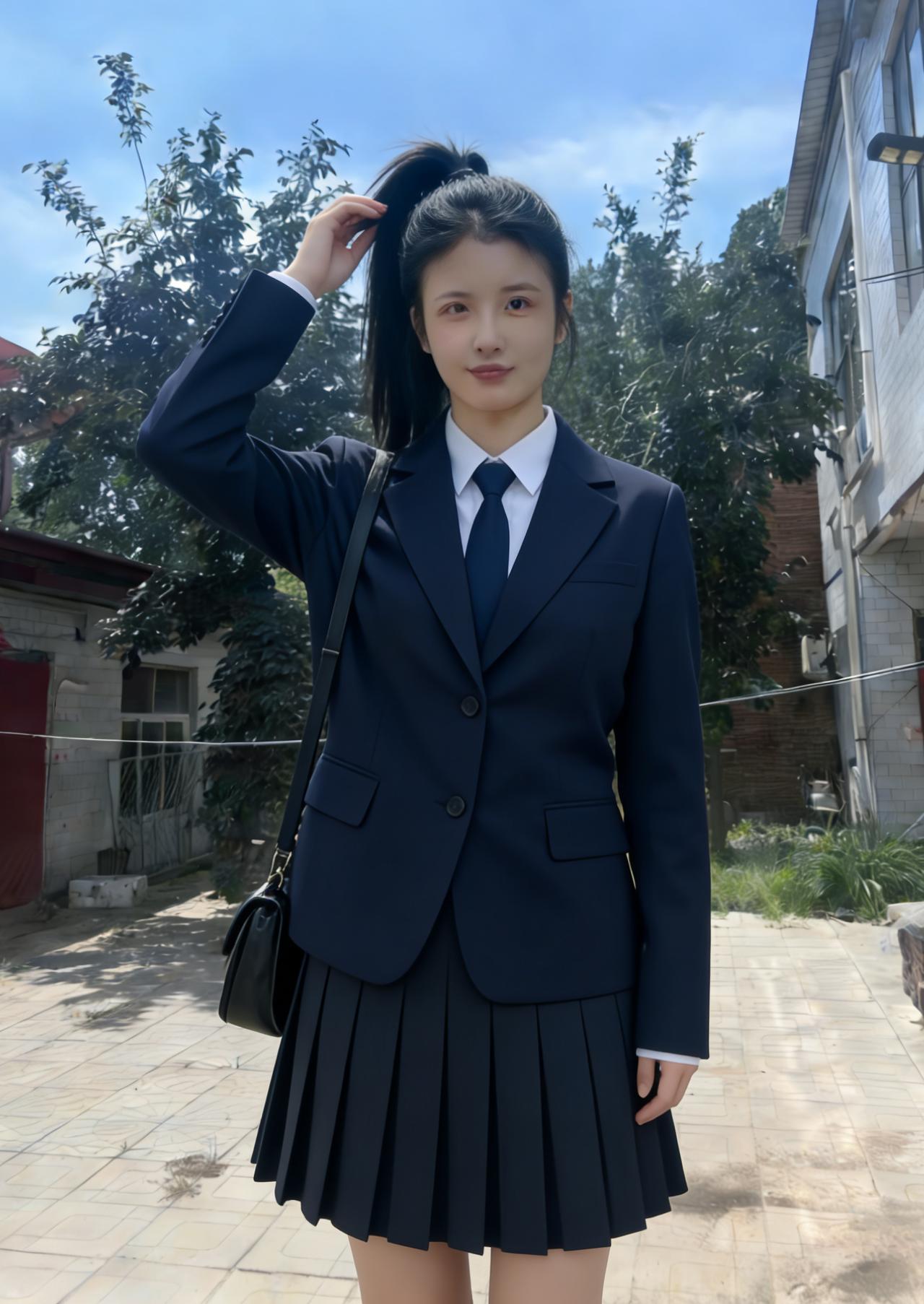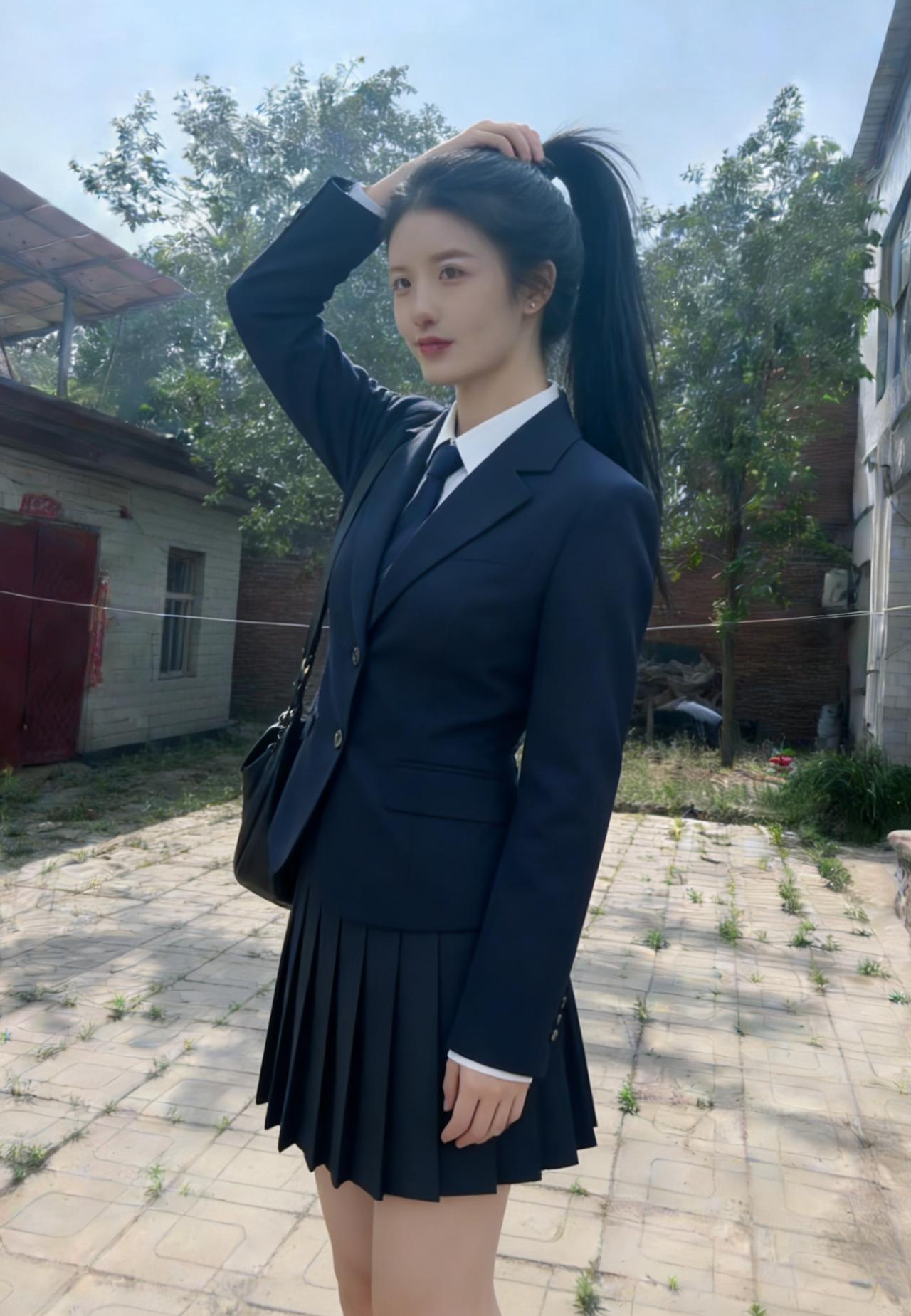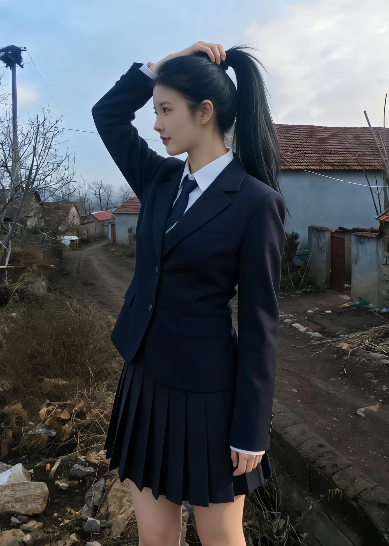 青石铺就的小径,延伸向远山的朦胧 枯树的枝丫,勾勒出浅蓝的苍穹 你侧身而立,马尾轻扬,自成一道风景 藏青的西装,裹着少女最清隽的骨相 ~ 侧脸的轮廓,柔和又利落 唇间噙着浅淡的笑意,温而不柔 指尖挽起垂落的发丝,动作轻缓 像挽起一段,不慌不忙的年少时光 ~ 红瓦石墙,是故乡最朴素的底色 荒草与碎石,铺着人间最真实的温良 你与这烟火乡野,相融又相衬 都市的利落西装,撞进山野的恬淡安详 ~ 没有霓虹璀璨,没有人海熙攘 只有晴空、老树、老屋,与你对望 眼眸清亮,盛着未被世俗沾染的光 百褶裙轻垂,藏着少女的柔软与倔强 风从田野来,拂过你的发梢与衣裳 把青春的模样,刻在这朴素的土地上 一抬首,一回眸,皆是不染尘的清朗 这人间的美好,大抵就是这般干净的模样
