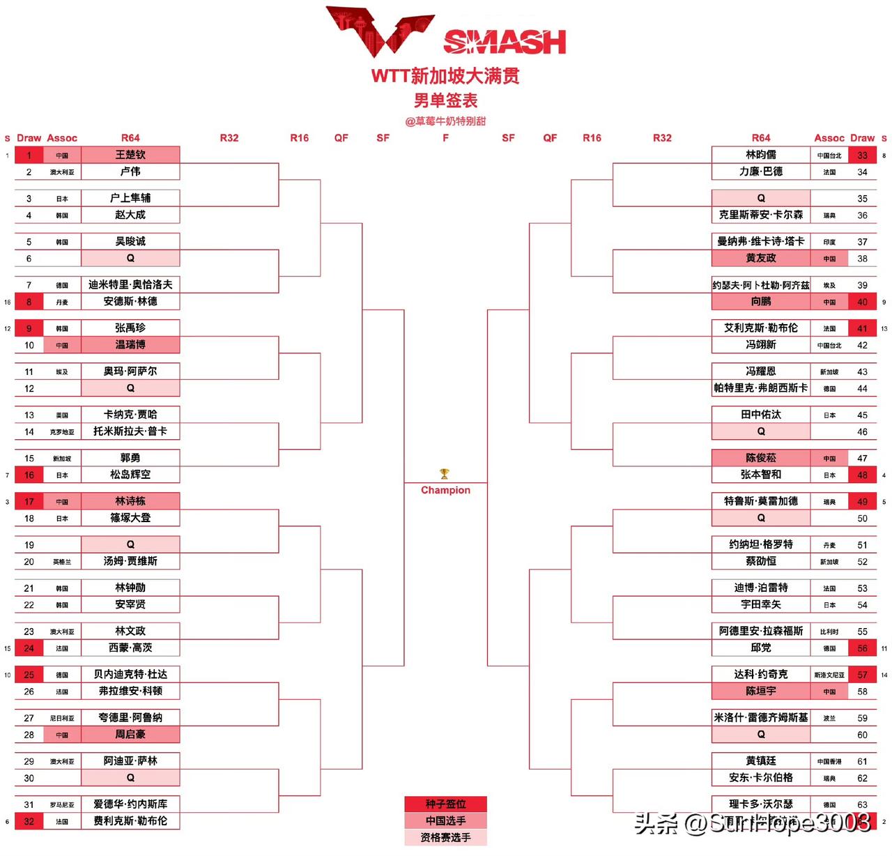 新加坡大满贯男单签表,王楚钦林诗栋果然碰到了,并且王楚钦所在的上半区压力非常大。 林诗栋世界排名掉到第三,没有了自己的大种子位, 这一次抽到了上半区, 王楚钦在1/4区,林诗栋在2/4区,只能有一人进决赛。 王楚钦,温瑞博在1/4区, 林诗栋,周启豪在2/4区, 这个上半区勒布伦,杜达,林德,奥恰,户上,西蒙等, 再加上我们的队友们,真的是神仙打架。 下半区,黄友政,向鹏到一起了, 陈俊菘首轮就是张本智和,加油呀,希望中国大满贯的那个劲继续使出来。 陈垣宇第一轮达科,也是考验。 中国队加油!