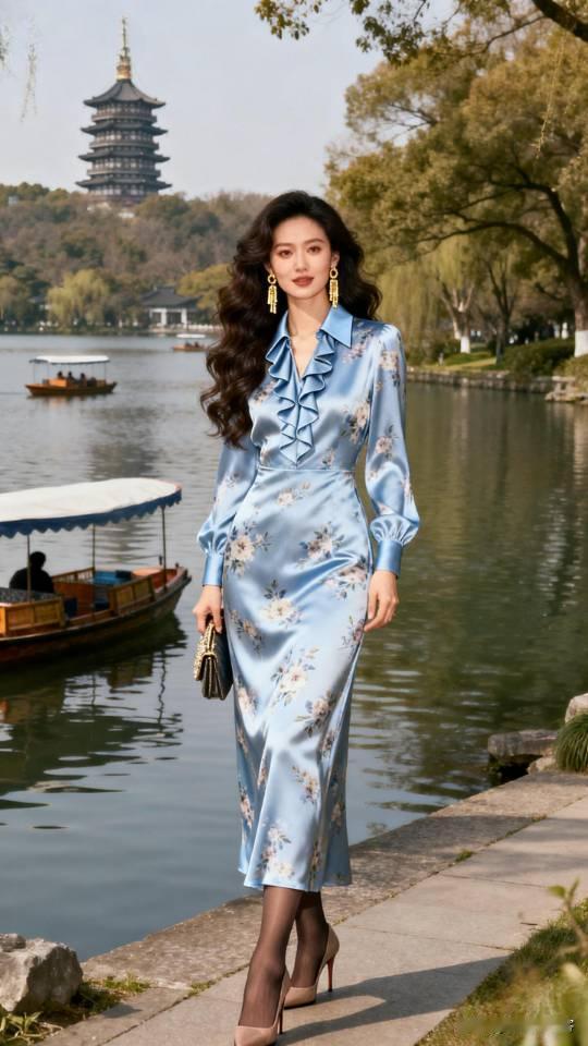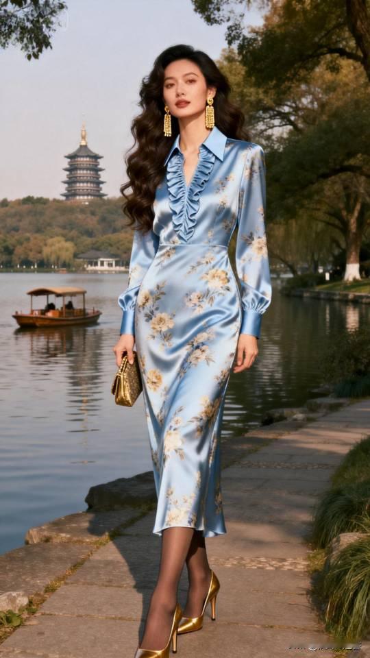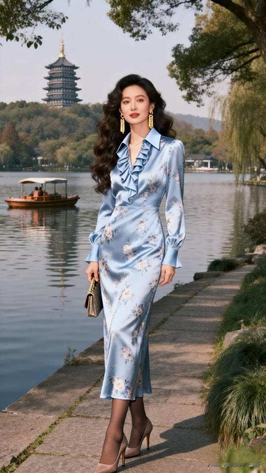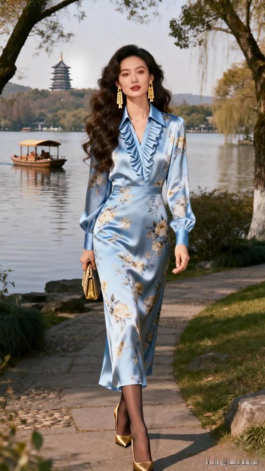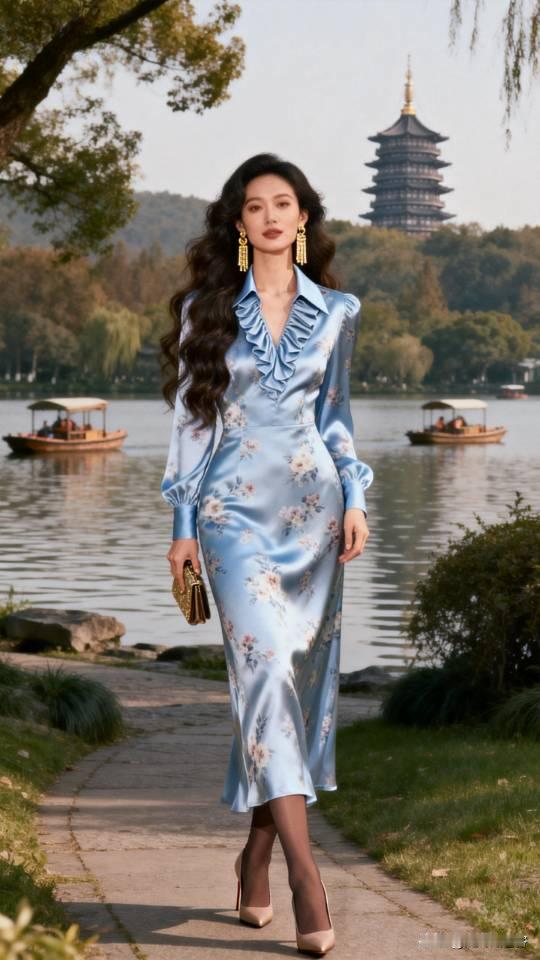 优雅漫步在湖畔,浅蓝色连衣裙与自然景色相得益彰。连衣裙 美女壁纸