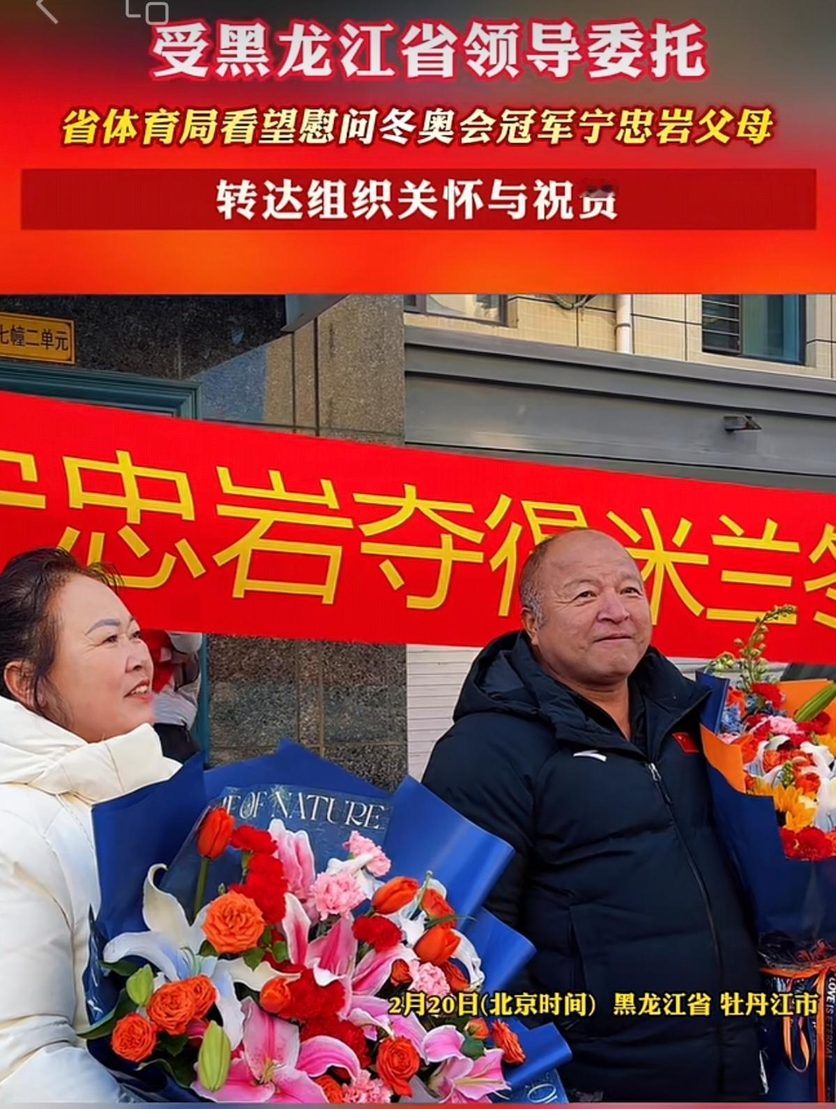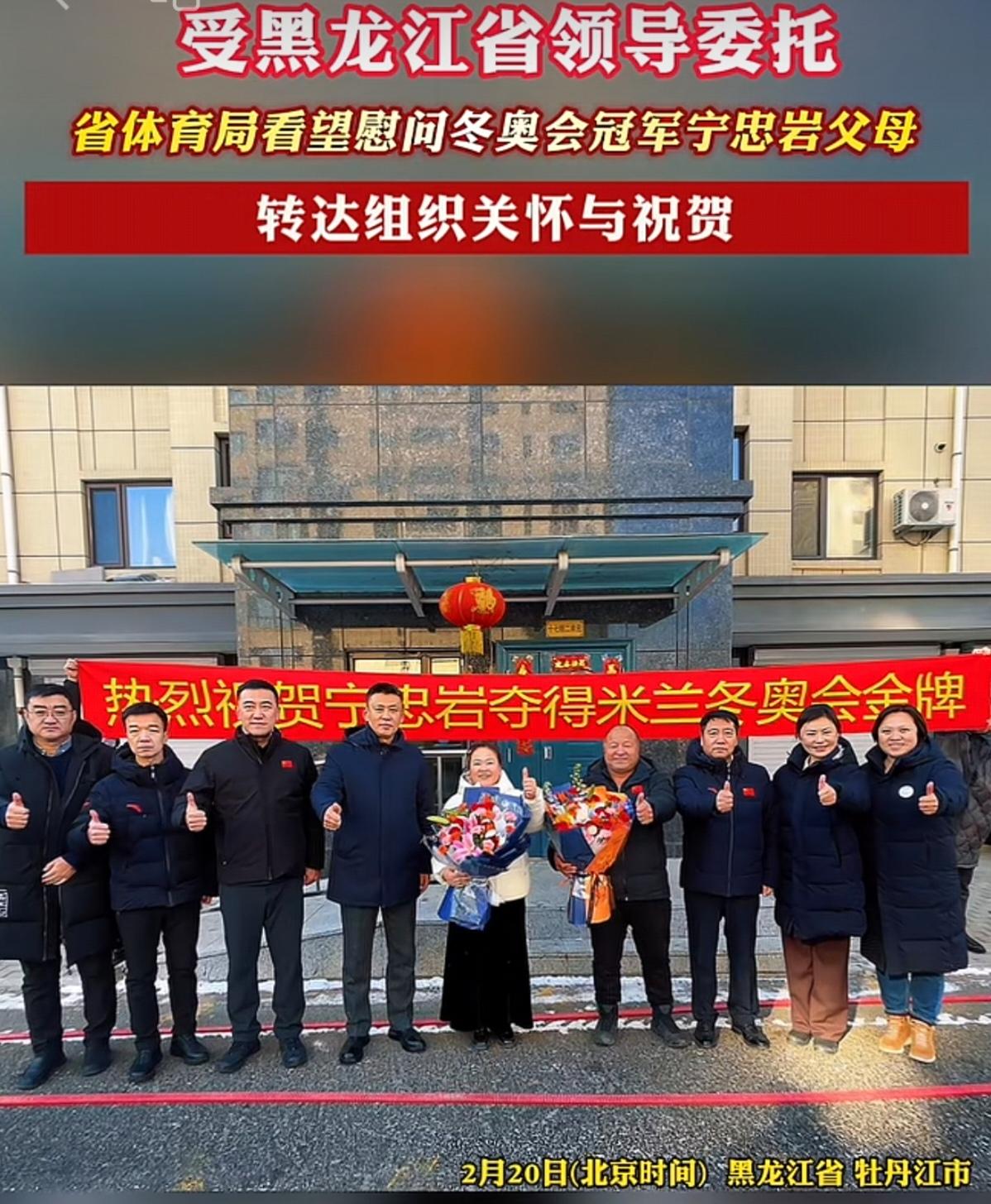 宁忠岩米兰冬奥会夺冠,黑龙江体育局领导前往其家乡看望慰问宁忠岩父母,老两口一夜无眠! 受黑龙江省领导委托,黑龙江省体育局联合牡丹江、宁安市相关部门,第一时间赴牡丹江宁安市石岩镇,看望慰问宁忠岩父母。 宁忠岩在速度滑冰男子1500米以1 分41秒98破奥运纪录夺冠,为中国拿下本届冬奥第三金。 2月20日上午米兰冬奥宁忠岩夺金后, 省体育局副局长庄士超(带队) 牡丹江市文体广电和旅游局局长鄂艳娟 省冰上训练中心领导班子 宁安市副市长李丹、市教体局局长房修林 宁忠岩启蒙教练陈培军(牡丹江冬训中心) 送上鲜花与祝贺,转达省领导关怀 ,感谢家属多年默默支持,称赞宁忠岩为国、 为龙江争光。与家人分享夺冠喜悦,回顾成长与拼搏历程。 父母彻夜未眠看直播,夺冠时相拥而泣。父亲红着眼圈:“孩子终于圆梦了!”母亲激动得一宿没睡,为儿子骄傲。
