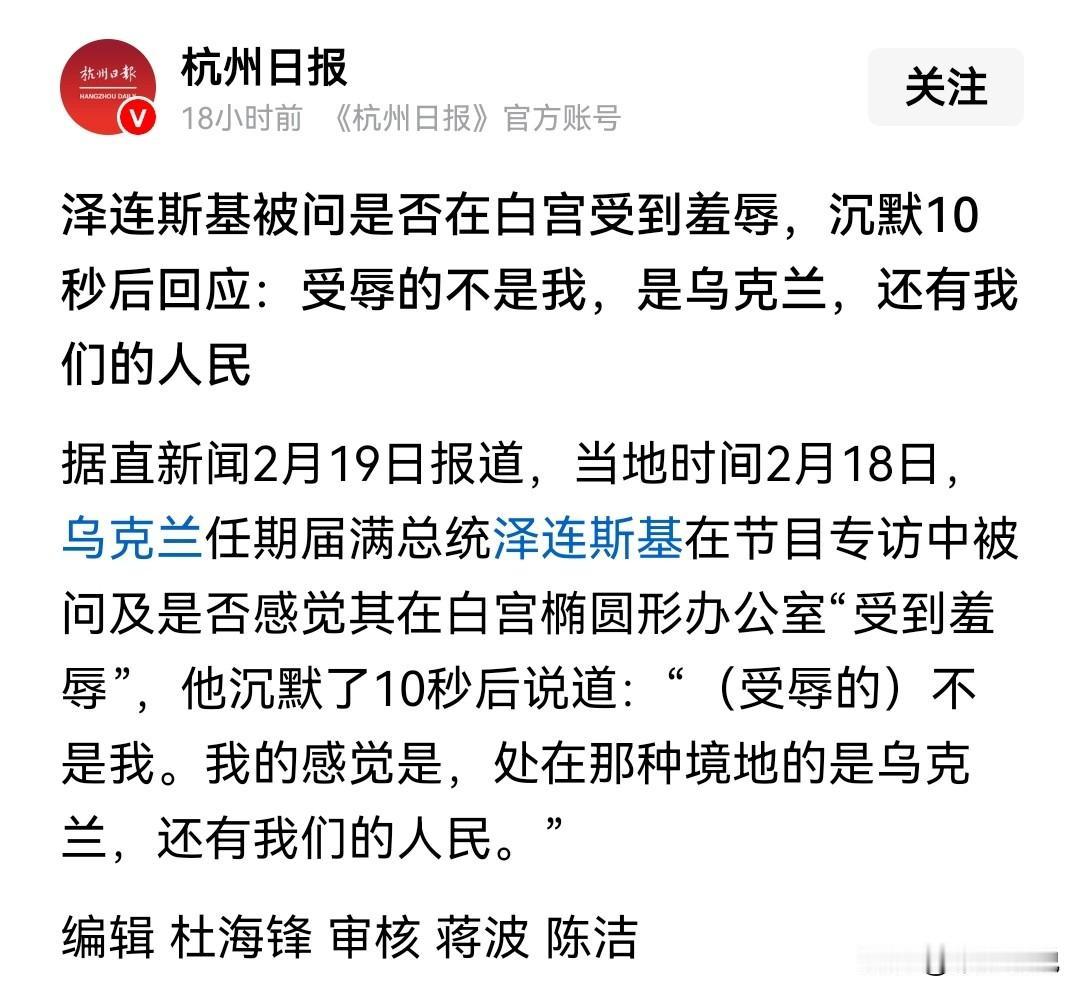 泽连斯基这话没毛病,受屈的不是自己而是乌克兰 泽连斯基在2月18日的接受媒体采访时被问到“是否感觉其在白宫收到了羞辱”时,泽连斯基称受辱的不是自己而是乌克兰。 泽连斯基这话说的没有毛病,因为受辱时泽连斯基是乌克兰的总统,一个国家的总统受辱就等于这个国家受到了侮辱。 然而泽连斯基受辱也是自找的,自己非要用加入北约来挑衅俄罗斯,结果被俄罗斯入侵,现在已经支撑不下去了,本来被美国寄予厚望的泽连斯基在白宫受辱也就是必然了。